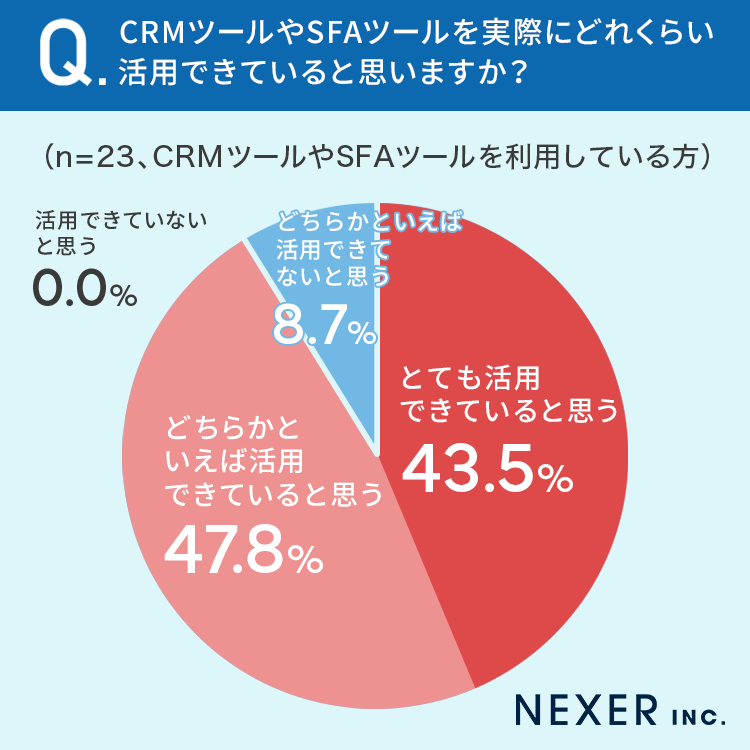 続いて「CRMツールやSFAツールを利用している」と回答した方に、CRMツールやSFAツールを実際にどれくらい活用できていると思うか聞いてみました。