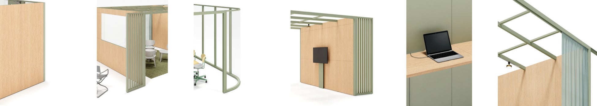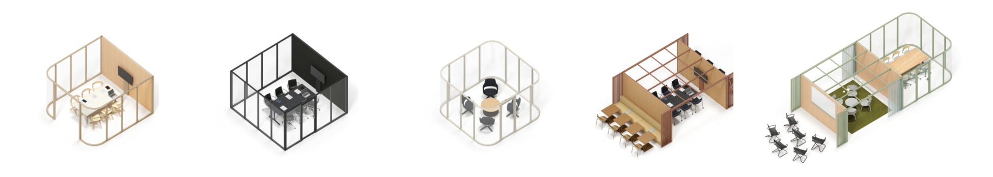 形状は5つのタイプから選択できます。モニターやホワイトボード付きのパネルも選択でき、空間に圧迫感を与えることなく、ブレインストーミングやミーティングなどのアクティビティをサポートします。またリビングライクな空間にも馴染むカラーリングや、印象的なR型のガラスパネルなど、ディティールまでこだわってデザインしています。天井グリッドには照明やカーテンを吊るすことができ、より多彩な空間演出が可能です。