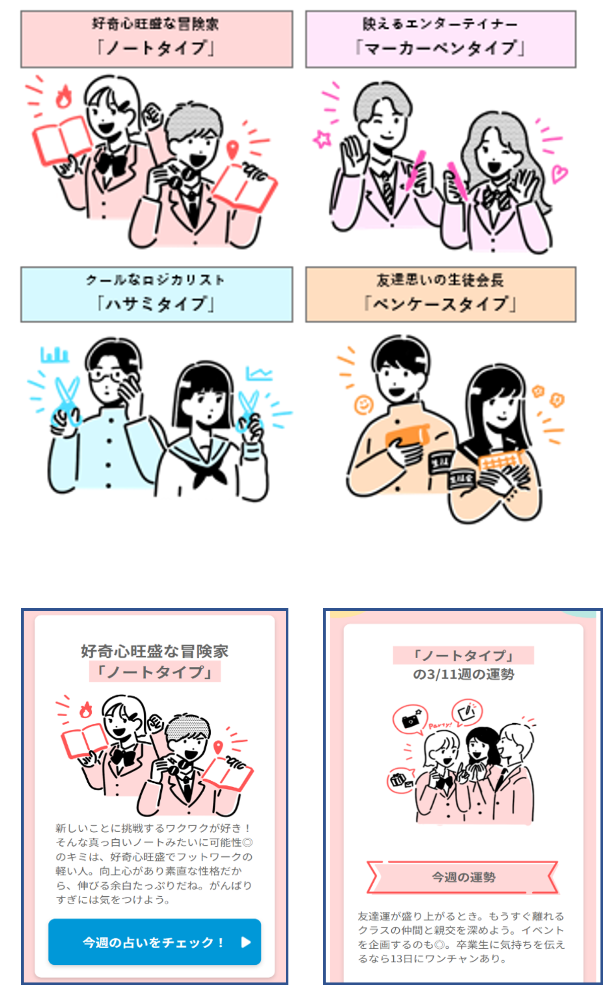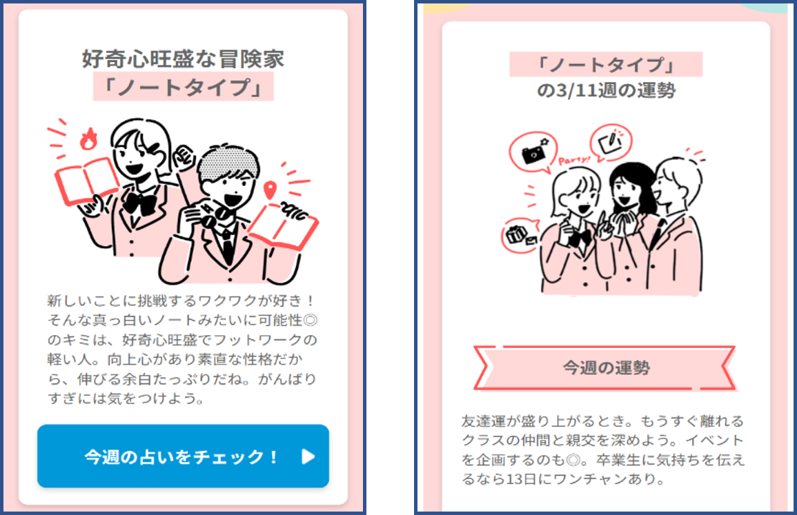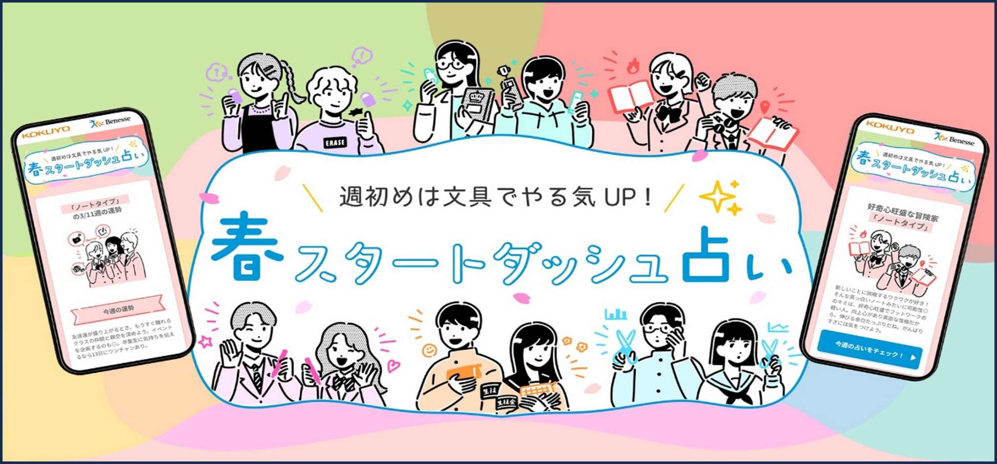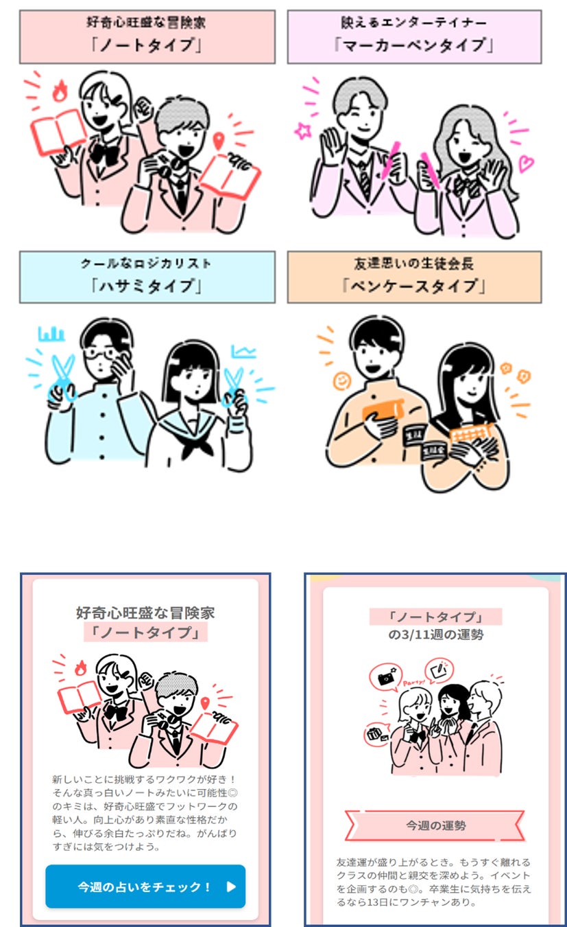 コンテンツは2種あり、一つ目は、5つの問いに答えることで文具にちなんだ6タイプから自分の性格タイプを診断できる「ついやってみたくなる文具タイプ診断」です。二つ目は、タイプ診断に合わせた今週の運勢やラッキーアイテムの文具、勉強方法がわかる「毎週更新の占いコンテンツ」を3月から5月下旬まで12週毎週お届けします。これらを通して、新学期におけるクラスメイトとのコミュニケーションのきっかけとなることを目指します。さらに本コンテンツ開設と合わせて、春スタートダッシュキャンペーンも開催いたします。