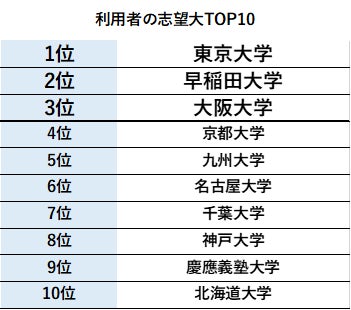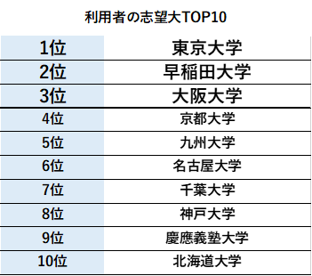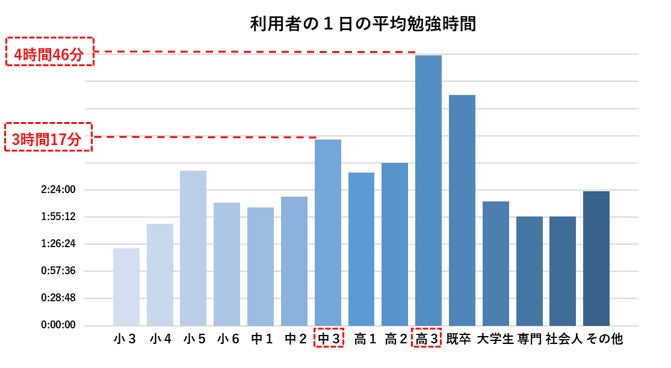学年別の1日の平均学習時間は高3生、中3生の受験を控えた学年が多く、それぞれ4時間46分、3時間17分となっています。また、利用者が登録している志望大学は東京大学が最も多いのが特徴のアプリとなっています。