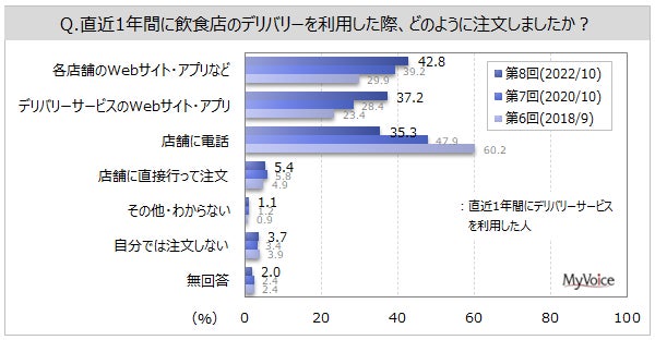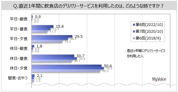| <今 回>(2022/10)https://myel.myvoice.jp/products/detail.php?product_id=29106 ※上記設問の他に「利用しているデリバリーサービスの種類」「サービス利用時の重視点」なども聞いています。 <第7回>(2020/10)https://myel.myvoice.jp/products/detail.php?product_id=26709 <第6回>(2018/9)https://myel.myvoice.jp/products/detail.php?product_id=24205 |