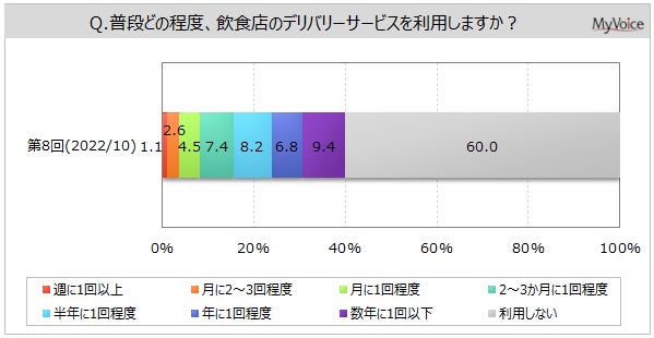 マイボイスコム株式会社(東京都千代田区、代表取締役社長:高井和久)は、8回目となる『デリバリー』に関するインターネット調査を2022年10月1日~5日に実施しました。本調査のデリバリーは、食事のデリバリーを対象としています。調査結果をお知らせします。