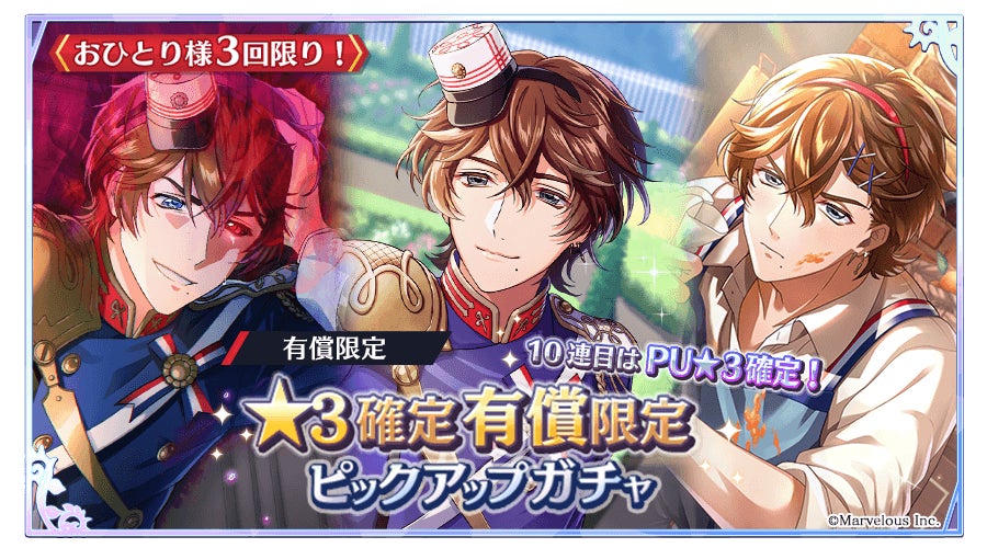 株式会社マーベラス(代表取締役社長:佐藤 澄宣/所在地:東京都品川区)による、スマートフォンゲーム『千銃士:Rhodoknight』(読み:せんじゅうし ろーどないと 以降、『千銃士R』)は、期間限定カードの★3「【努力のキッチン】シャスポー(CV: 江口拓也)」なども登場する★3確定有償ピックアップガチャを開催いたします。