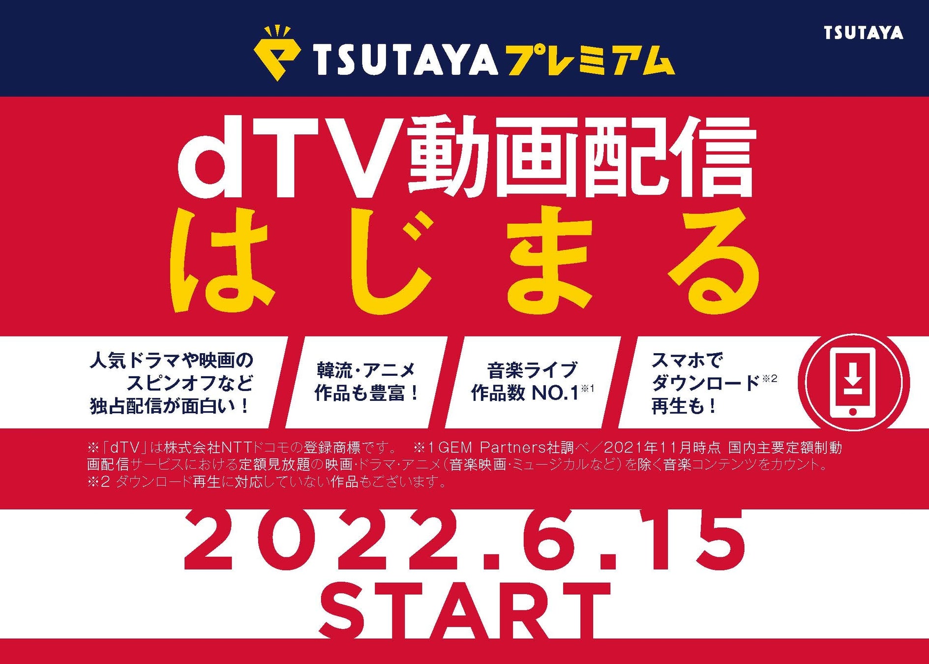 「TSUTAYA」と「dTV」は、店舗とネットにおける両社の強みを活かし、デジタル未配信作品やオリジナル 作品をはじめとしたコンテンツの連携などを検討しながら、お客さまの生活スタイルに合わせてお楽しみいただける、便利で快適なエンターテインメントを提供してまいります。