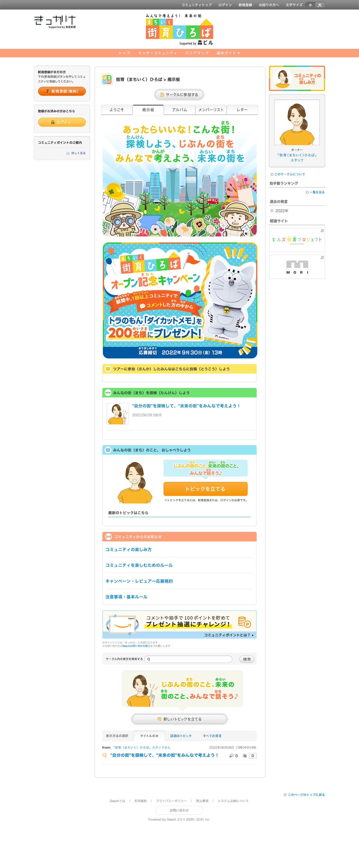 2022年7月28日、産経新聞社(東京都千代田区/代表取締役社長:近藤 哲司)と、ファンコミュニティ構築・運営大手のクオン(東京都港区/代表取締役:武田 隆)は、新コミュニティ 「街育ひろば Supported by 森ビル」( https://www.beach.jp/community/MACHI-IKU/ )を、産経新聞社のコミュニティである「きっかけ」内にオープンしました。「街育ひろば」は、森ビルが展開する親子向け体験活動プログラム「ヒルズ街育プロジェクト」と連動し、幅広い世代がともに、次世代の都市のあり方を考えるコミュニティです。