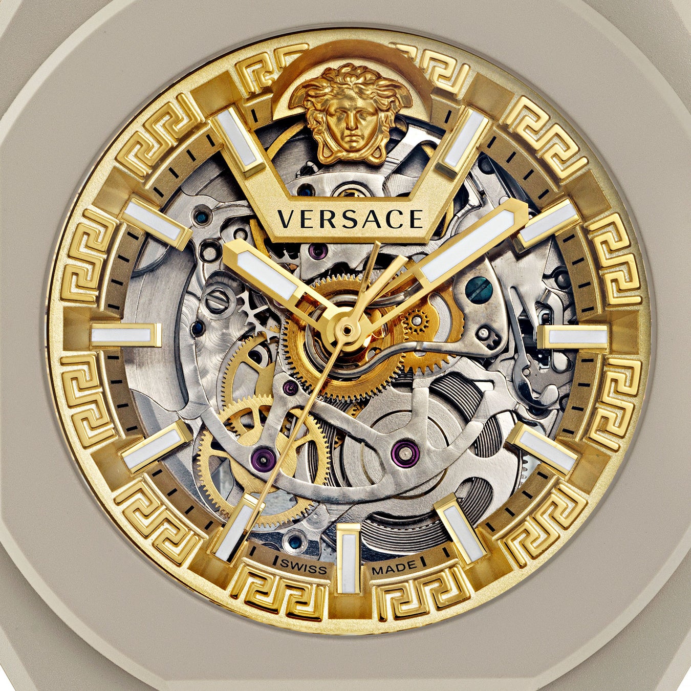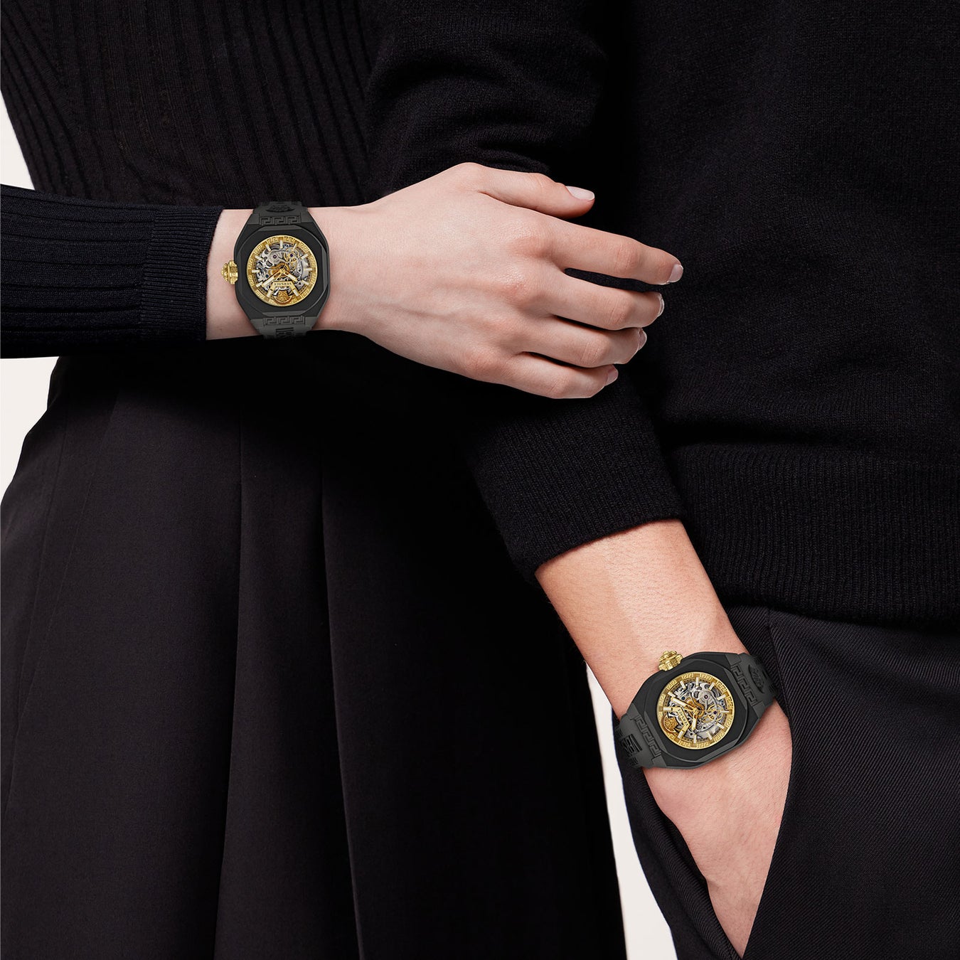 「V LEGEND SKELETON (ブイ レジェンド スケルトン)」は、 “持続可能性×ヴェルサーチェのDNA ×ラグジュアリー感”を併せ持つ、サステナブルでトレンディなタイムピースです。ケースにはエコセラミック、ストラップにはバイオポリウレタンを使用し、環境保護に配慮しています。ダイヤルは、リッチなゴールドの装飾を施したフルスケルトン仕様。ブランドのアイデンティティを生かした高級感あふれるデザインに仕上げています。