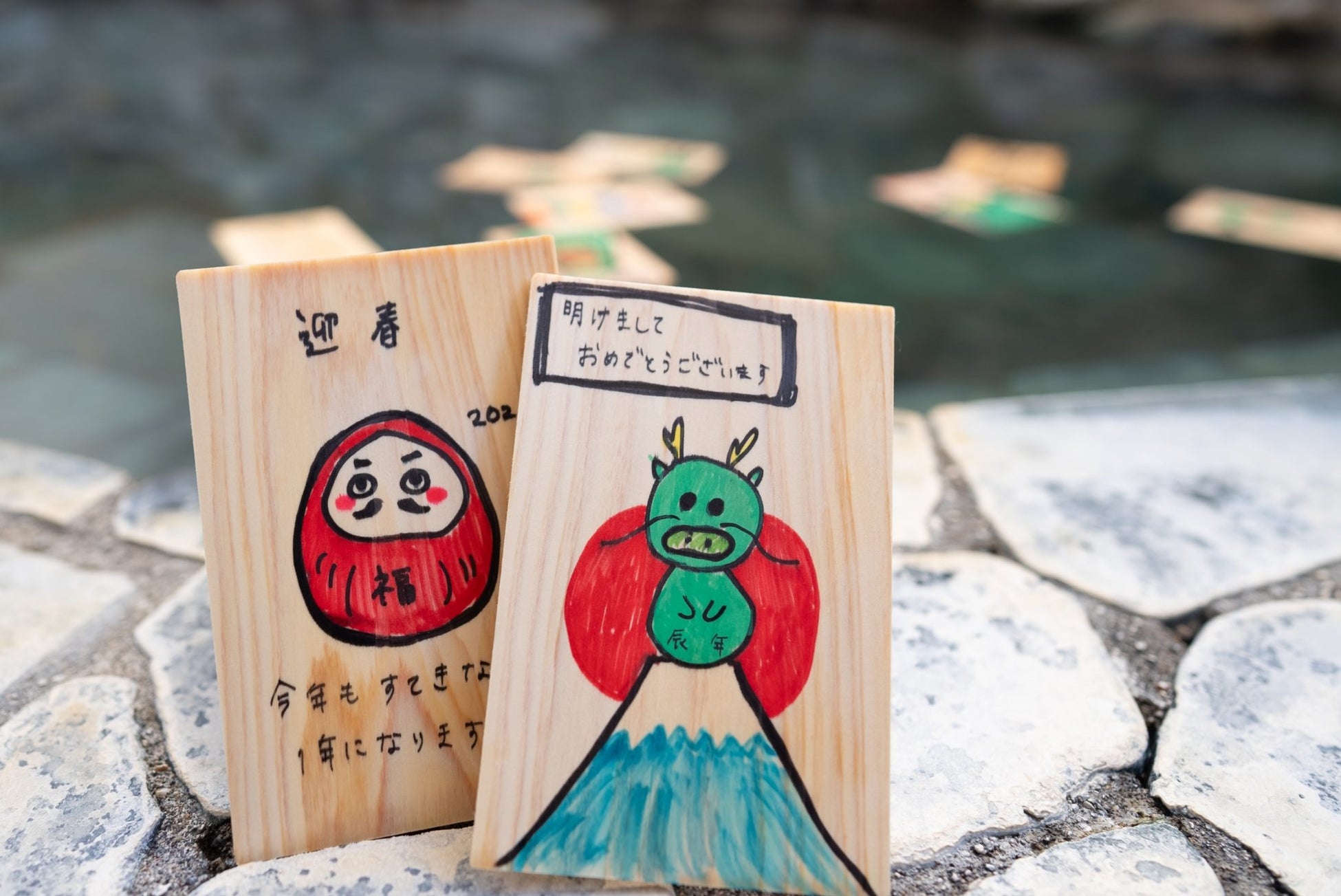 森林整備の一環から生まれる間伐材をリサイクルした「年賀状型ヒノキ」に、スタッフから新年のご挨拶や、日頃の感謝、2026年の抱負などをしたためて露天風呂に浮かべます。