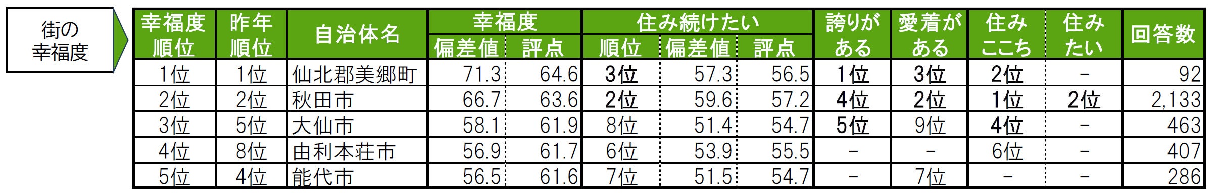 街の幸福度1位は4年連続で仙北郡美郷町。2位は3年連続で秋田市。3位大仙市。