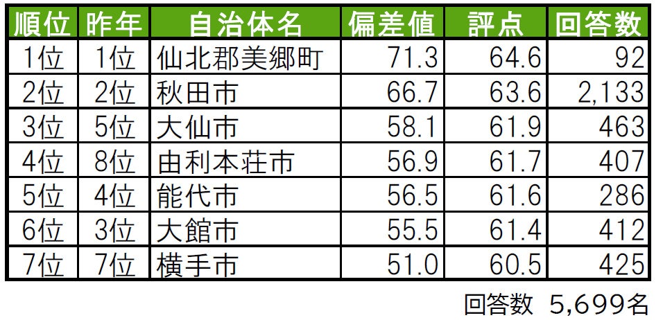 1位は4年連続で仙北郡美郷町で、「住みここち」では2位となっています。仙北郡美郷町は、トップ7内で唯一郡部に属する「町」で、唯一偏差値70台の高い評価を得ています。2位は3年連続で秋田市で、「住みここち」では1位の街です。3位は大仙市で、昨年5位から順位を上げました。その他、トップ7内では、由利本荘市(ゆりほんじょうし)が昨年8位から順位を上げて4位となっています。