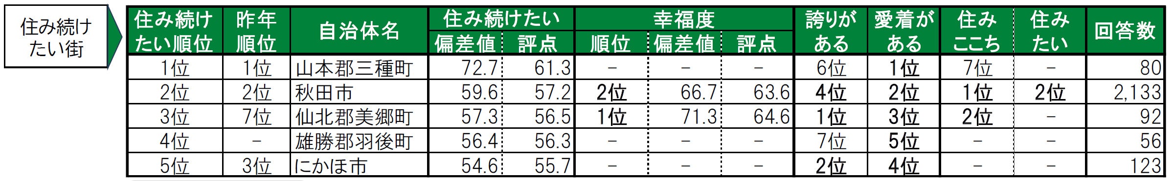 住み続けたい街は1位は3年連続で山本郡三種町。2位は4年連続で秋田市。3位仙北郡美郷町。