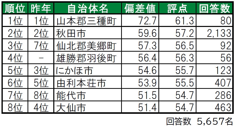 3年連続で山本郡三種町が1位で、唯一偏差値70台の高い評価を得ています。2位は4年連続で秋田市です。3位は仙北郡美郷町で、昨年7位から順位を上げました。その他、昨年から順位を上げてトップ8入りしたのは、4位の雄勝郡羽後町(おがちぐん うごまち)(昨年は偏差値50未満のため順位非公開)です。