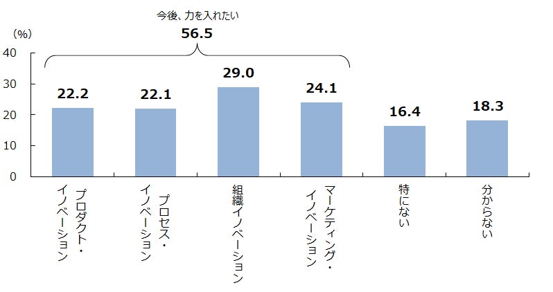 今後、イノベーション活動に力を入れたいと考えている企業は56.5%だった。タイプ別では、いずれも2割台となっていたが、なかでも「組織イノベーション」が29.0%で最も高かった(複数回答、以下同)。業務遂行の方法や手順などの業務慣行、権限の移譲、仕事の割り振り・編成などの職場組織、社外との関係構築といったイノベーションを通じて新しい変革を進めていこうとする認識が高くなる傾向がうかがえる。