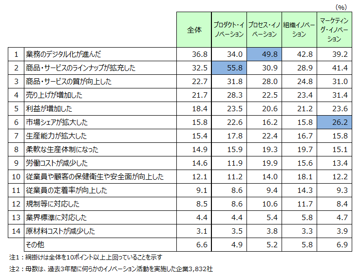 [3] プロダクト・イノベーションとは、自社にとって新しい製品・サービスを市場へ導入することを指す。既存の知識や技術を組み合わせたり、新しい用途へ転用したものを含む。例えば、機能や性能、使いやすさ、ソフトウェア、提供方法(サービス)について、新しいまたは既存の製品・サービスを大幅に改善したもの。有形物だけでなく小売や保険など無形物も含む