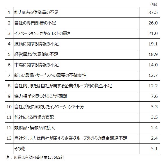イノベーションの阻害要因、「能力のある従業員の不足」が37.5%でトップ