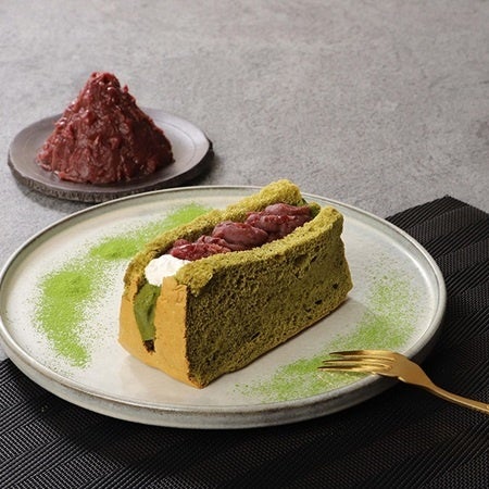 抹茶シフォンケーキに自家製お濃茶カスタードクリーム、あずきを重ねた3層仕立て。