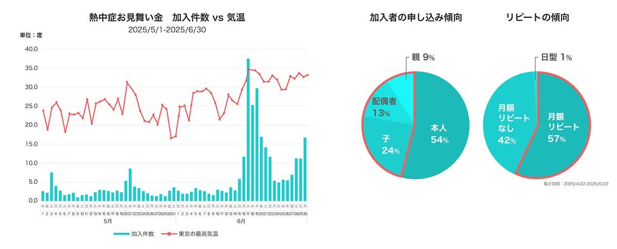 本保険は、加入期間が「月額型」「期間選択型」から選択でき、月額型は申込日の翌日から保障が開始されますが、期間選択型の場合は、午前9時までに申し込むと、当日午前10時から保障が開始されます。そのため、最高気温が真夏日予想の日には、加入件数が伸びる傾向にあります。また、本保険加入者の約半数は申込者本人ではなく、申込者の子どもや配偶者、親など家族のために契約しており、子どもの部活動に備えたり、遠方に住む高齢の家族のために加入したりするケースも多くみられます。