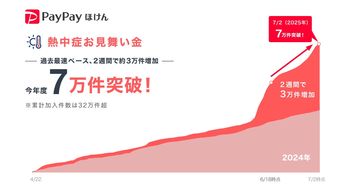 LINEヤフー株式会社(以下、LINEヤフー)のグループ会社であるPayPay保険サービス株式会社(以下、PayPay保険サービス)とZフィナンシャル株式会社、PayPay株式会社(以下、PayPay)は、キャッシュレス決済サービス「PayPay」内の「PayPayほけん」ミニアプリ(※1)において、2025年4月22日より提供を再開した「熱中症お見舞い金」(以下、本保険)の今年度の加入件数が、サービス提供開始以降、最速で7万件を突破しました。(※2)今年度の加入数は、昨年度の同時期と比較しても約2倍のペースで増加しています。また、累計加入件数は、サービス提供開始から約4年で32万件を突破しています。(※3)