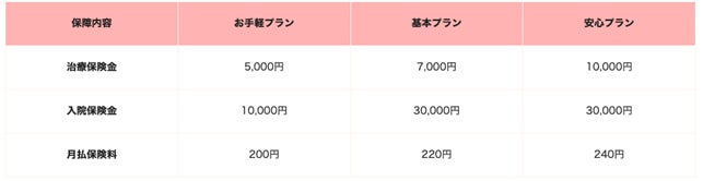 月額型は「お手軽プラン」「基本プラン」「安心プラン」の3種類で提供。期間選択型は1プラン(保険金額は月額型の安心プランと同等)。ユーザーのニーズに応じた幅広いプランを用意しています。