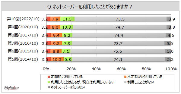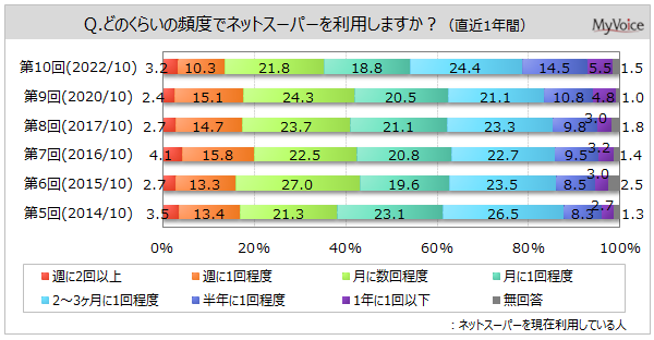 | <今 回>(2022/10)https://myel.myvoice.jp/products/detail.php?product_id=29105 ※上記設問の他に「直近1年間に利用したネットスーパー」「コロナ禍による利用状況の変化」も聞いています。 <第9回>(2020/10)https://myel.myvoice.jp/products/detail.php?product_id=26708 <第8回>(2017/10)https://myel.myvoice.jp/products/detail.php?product_id=23111 |