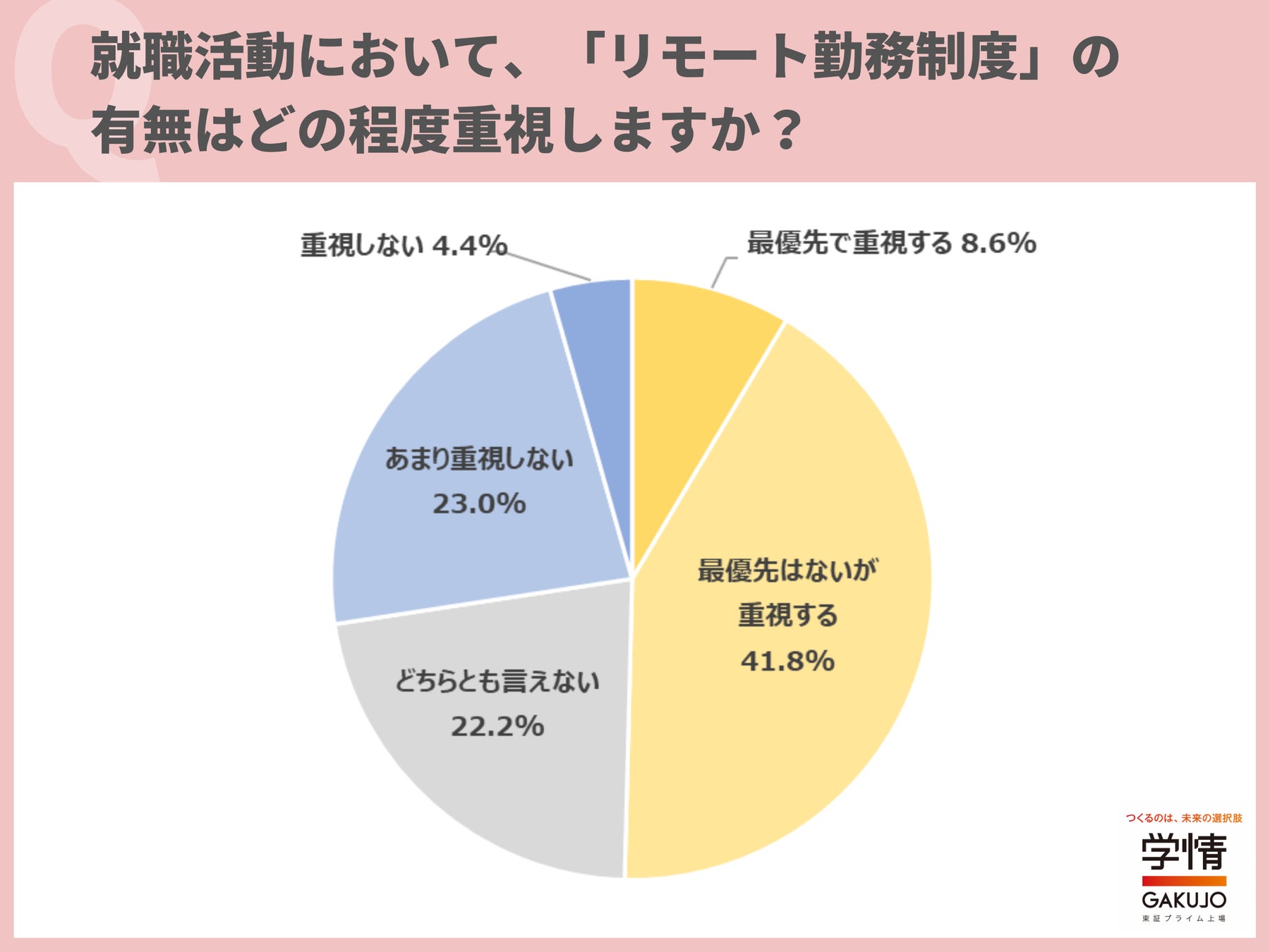 就職活動において、「リモート勤務」の有無を重視すると回答した学生が半数を超える結果となりました。一方、「最優先で重視する」の回答は8.6%に留まり、最優先事項ではないことが分かります。「今は重視していないが、将来的には必要性を感じるようになると思う」「出産や育児で出勤が難しい場合に、リモート勤務制度があると助かる」「リモート勤務制度が整っている方が、他の面でも柔軟な対応ができる企業というイメージがある」といった声が寄せられました。