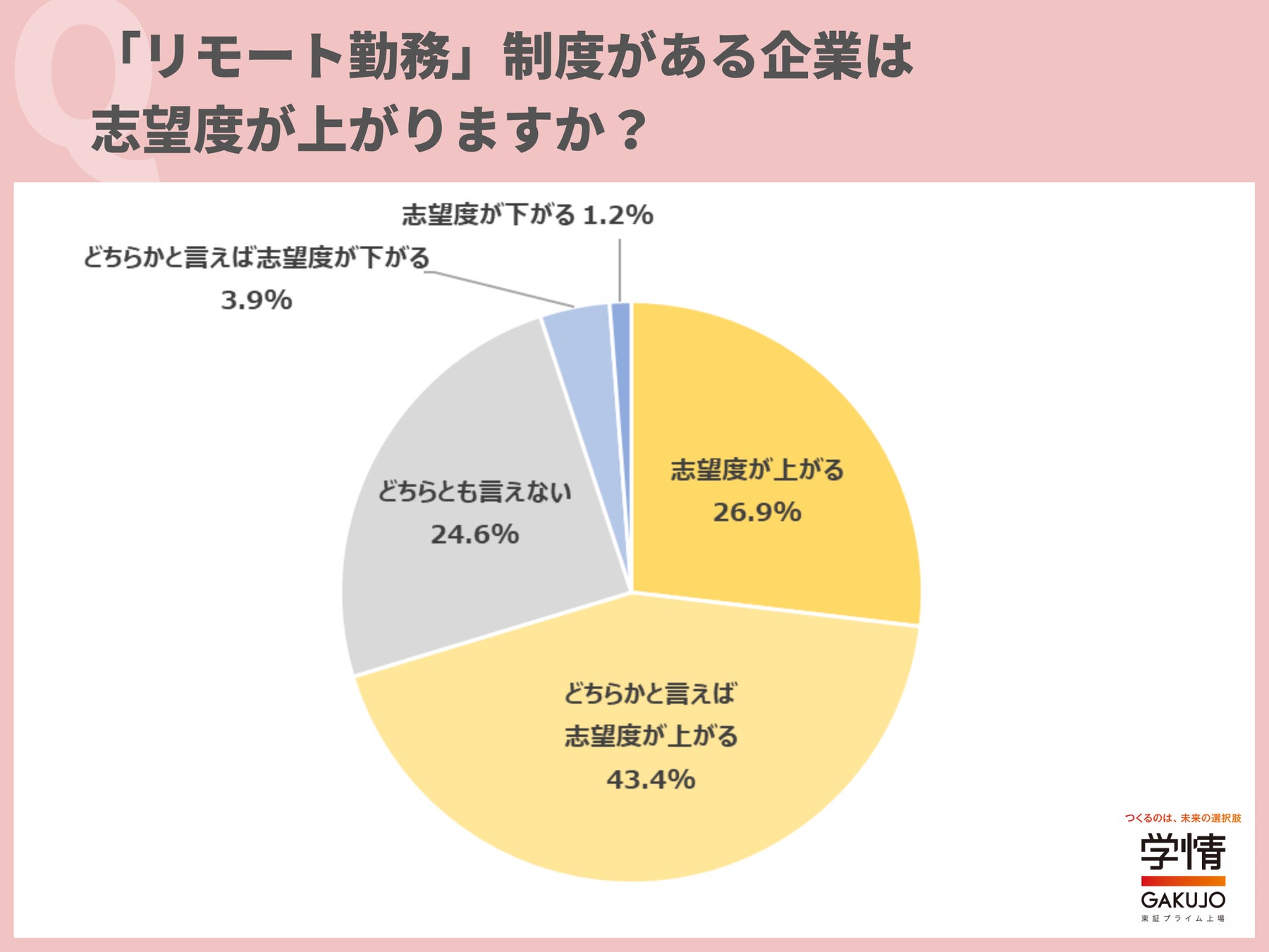 株式会社学情(本社:東京都中央区)は、2026年3月卒業(修了)予定の大学生・大学院生を対象に、インターネットアンケートを実施。今回は、「リモート勤務」について調査しました。「リモート勤務」制度がある企業は、「志望度が上がる」と回答した学生が7割を超えました。「通勤時間の削減に繋がり、時間を有効活用できる」「ライフステージが変化した時にリモートで働ける選択肢があると嬉しい」といった声が上がっています。「フルリモート」や「居住地自由」の企業について、「志望度が上がる」と回答した学生が7割に迫る結果となりました。また半数以上の学生が、就職活動において、「リモート勤務」の有無を重視すると回答。「今は重視していないが、将来的には必要性を感じるようになると思う」「リモート勤務制度が整っている方が、他の面でも柔軟な対応ができる企業というイメージがある」といった声が寄せられました。
