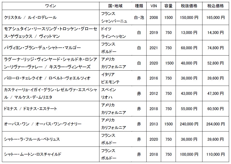 提供するワインは、ルイ・ロデレール・クリスタル2008年のマグナムボトルをはじめ、ドミナス2018年やシャトー・ムートン・ロスチャイルド2018年など全10銘柄です。会場は東京・六本木のステーキの名店「RUBY JACK'S STEAKHOUSE PRODUCED BY TWO ROOMS」で、当イベントのために考案されたコースディナーと共に楽しめます。