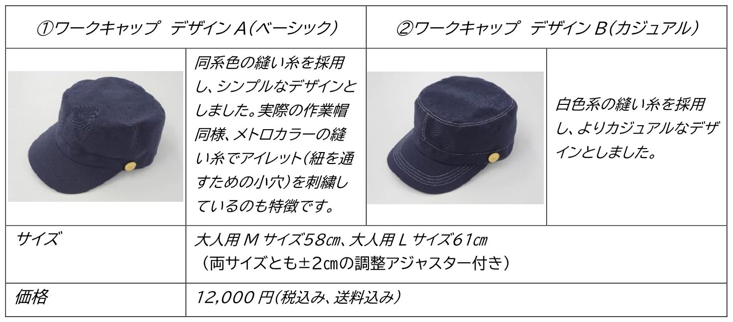 販売する商品は、営団地下鉄時代の制帽である「旧作業帽」をモチーフにした「ワークキャップ」全2種類(デザインA・B)です。生地を洗浄・裁断後に、当社の制帽製作を担当する同じ職人の手で、1点ずつ縫製を行います。また当社社員のアイデアから、廃棄予定だった運輸職用制服メタルボタンや、実際に使用されているネームタグも取り入れています。