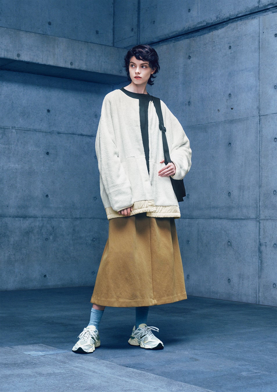 ウィメンズからは、丸みを帯びたシルエットとシャツのような軽やかさが特徴のノーカラーコートが登場。
