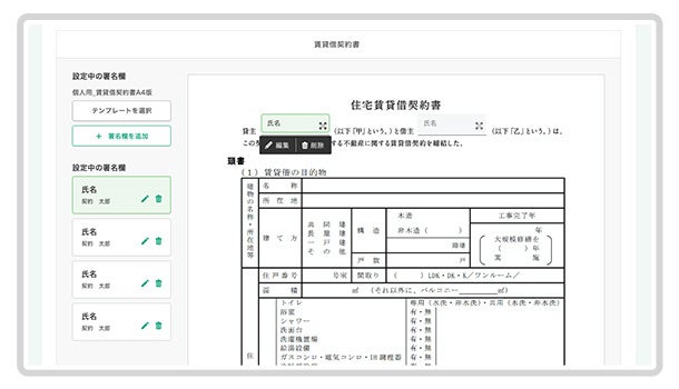 不動産の賃貸借契約において「家主」「管理会社」「仲介会社」「契約者」等の属性と契約フローを設定できるので、現在の契約業務の流れを変えることなく電子契約を運用できます。