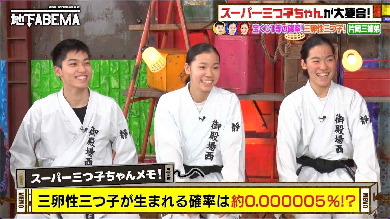 一卵性三つ子に比べてそれぞれの個性が際立ちやすいとされる三卵性三つ子。長女の優月さんは「3人の中で一歩下がってまとめ役」、次女の美月さんは「天真爛漫で負けず嫌い」、長男の恒惺(こうせい)さんは「女子2人に言い返せないタイプ」と、母・静香さんがそれぞれの性格を紹介します。幼少期から空手に打ち込み、現在は強豪校に通う3人は、その性格が空手のスタイルにも反映されていると語ったほか、優月さんと美月さんは、姉妹で80回以上対戦したと話すとスタジオは騒然。みちょぱさんが「2人が戦っているとき、恒惺はどっちを応援する?」と質問すると、恒惺さんは「どっちも応援していますが、美月のほうが勝つ回数が多いので、優月を応援している」と気遣いを見せ、スタジオは笑いに包まれました。