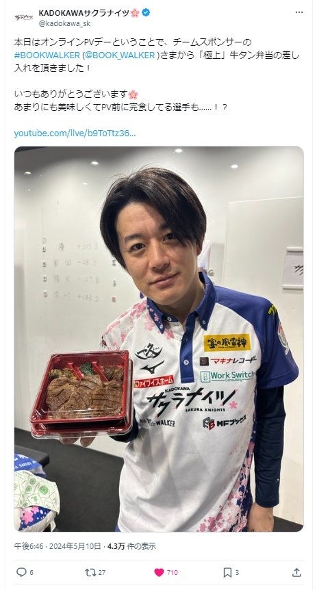 株式会社ブックウォーカーは、2021-2022シーズンから3期連続でKADOKAWAサクラナイツのチームスポンサーを務めており、今年度はMリーグのパブリックビューイング実施日に、豪華お弁当の差し入れなどを行ってまいりました。