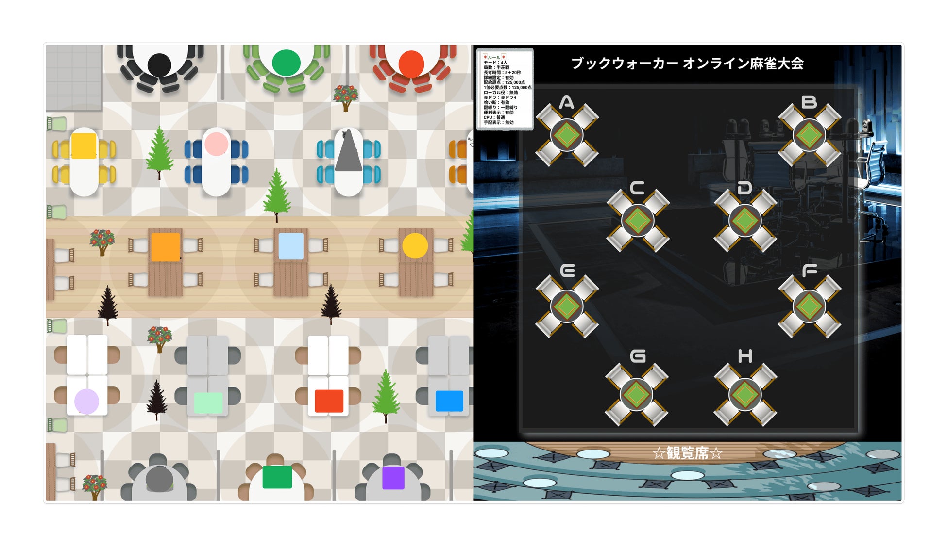 麻雀大会は、オンライン麻雀ゲームとバーチャルオフィスを併用し、勝負はゲーム上、コミュニケ―ションはバーチャルオフィス上で交わし合います。