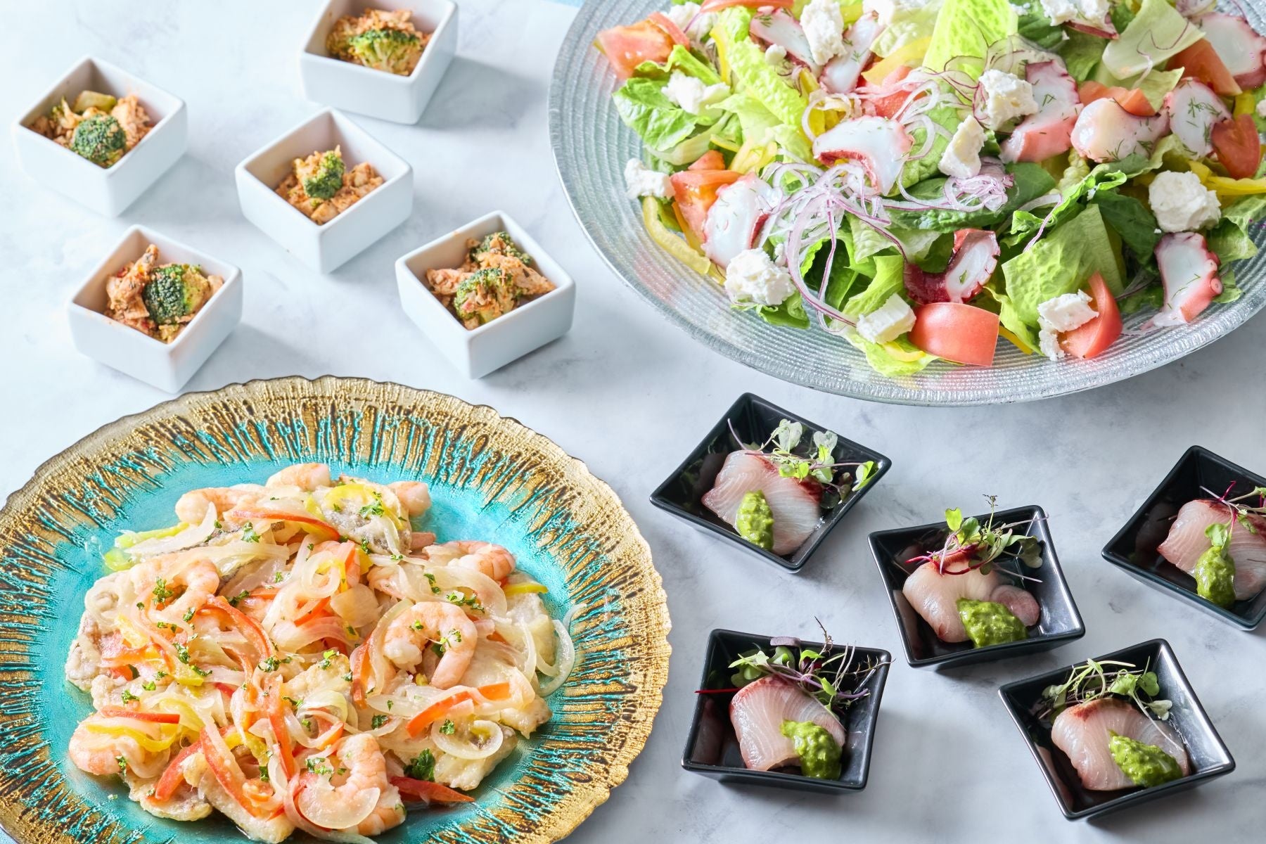 ファーストディッシュには、茸と広島県産の鶏を使用したレモンクリームのパイ包みスープをお席まで提供(ディナー限定)。その他のフードは、ギリシャ・コス島産のロメインレタスとギリシャの代表的なチーズであるフェタチーズを使用した「真ダコのグリークサラダ」は、フェタチーズの塩味が真ダコの旨味を引き立てます。ギリシャの伝統料理「ムサカ」は、牛肉・ナス・じゃがいもを層にして重ね、その上からホワイトソースとチーズをかけて焼き上げた、濃厚で食べ応えのある一品。ジューシーな鶏モモ肉のスブラキは、彩り豊かな新鮮野菜を“ピタパン”(地中海沿岸中心:空洞のある平たいパン)をお好みに合わせて自由にカスタムができるため、自分だけのオリジナル・ピタパンサンドをお召し上がりいただけます。パエリアやシーフードカレー、小エビのクリームパスタ、瀬戸内釜揚げしらす使用のピザなど魚介をふんだんに使用したグルメは“地中海をテーマにしたフェアならでは”のラインナップ。さらに、お寿司、天麩羅などの和食やチキンナゲット、ミニアメリカンドックなどのキッズメニュー(土日祝限定)もご用意しておりますので、親子3世代でお食事をお楽しみいただけます。