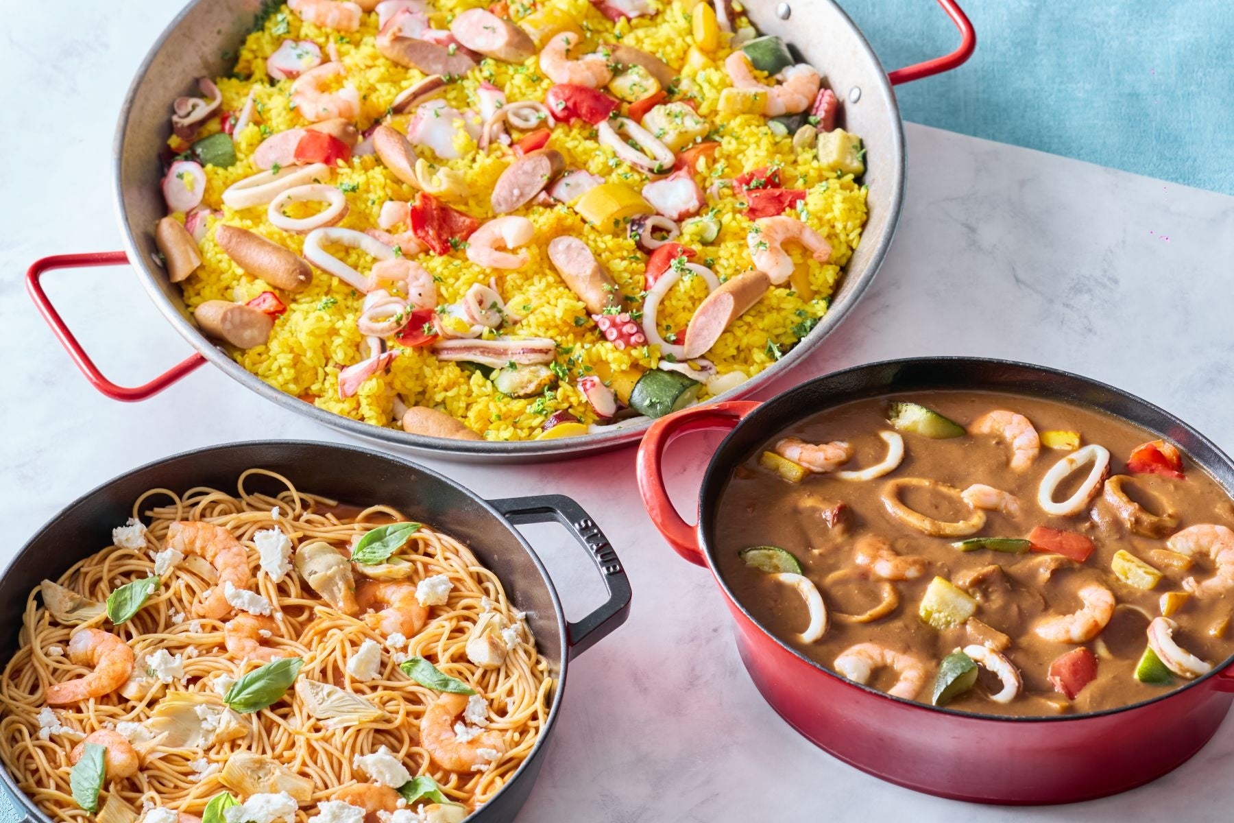 チョリソーと魚介のスパイシーパエリア/地中海風シーフードカレー/白米/アーティチョークのグレックと小海老のクリームパスタ オレンジの香り