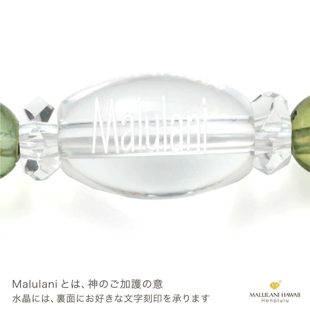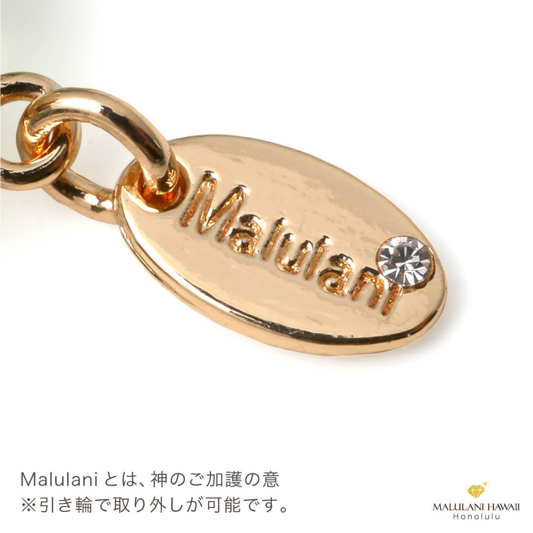 水晶とオリジナルチャームには、ハワイ語で「神に護られた」という意味を持つ「malulani」と刻印。 持つ人に「神のご加護がありますように」との祈りをのせています。