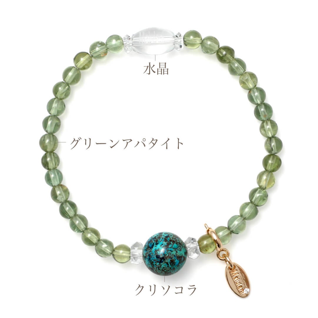 地球そのものが体現したかのような母性の石「クリソコラ」と、ドクターストーンのような再生エネルギーを感じさせる「グリーンアパタイト」を組み合わせたブレスレットは、健康やリラクゼーションを願う方、人生の転機をスムーズに乗り越えたい方のお守りに最適。