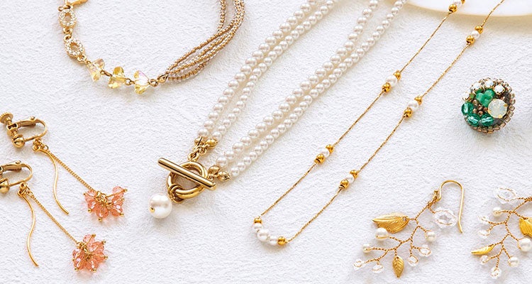 光を受けて上品に輝くパールやガラス、天然石などのビーズで、イヤリング、ネックレスなど大人のおしゃれを格上げしてくれるアクセサリーを作れます。