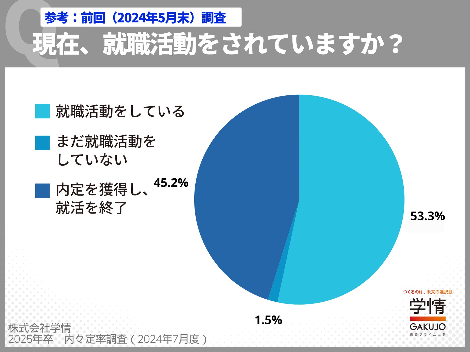 株式会社学情は、東証プライム上場・経団連加盟企業であり、法人株主として朝日新聞社・大手金融機関が出資し、10,000社以上の優良企業と取引する大手総合就職・転職情報会社です。会員数230万人の「20代向け転職サイト6年連続No.1〈Re就活〉」(※2019年~2024年 東京商工リサーチ調査 20代向け転職サイト 第1位)をはじめ、会員数40万人の「学生満足度2年連続No.1〈あさがくナビ(朝日学情ナビ)〉」(※2022年~2023年オリコン顧客満足度(R)調査 逆求人型就活サービス 就活支援コンテンツ第1位)や、「就職イベント来場数2年連続No.1〈就職博〉」(2023年~2024年 東京商工リサーチ調査 就職イベント 来場数 第1位)を運営しています。