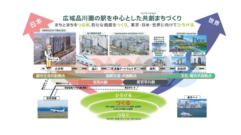 JR東日本は、羽田空港の国際化やリニア中央新幹線の整備による交通基盤の進化を見据え、国際交流拠点の実現を目指し、浜松町駅から大井町駅間の東京南エリアの各駅において、事業パートナーや地域の皆さまと連携しながら、駅を中心としたまちづくりを推進しています。そして、この田町駅を含む東京南エリアを「広域品川圏」と位置づけ、各まちの交流 (つなぐ)から新たな価値の共創(つくる)を促進し、東京・全国・世界に向けてひろげることで、東京のさらなる魅力と国際競争力の向上に貢献してまいります。