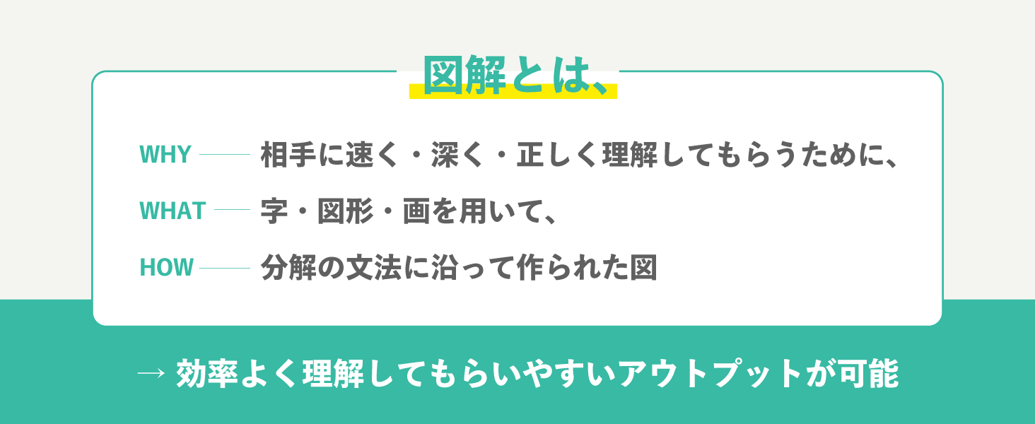 目的に沿って整理や整頓、図化をすることを前提とした上で、人間の目や脳が図解の情報を捉えて理解しやすいように作っていきます。