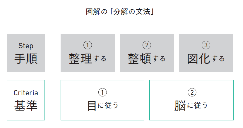 「分解の文法」とは、3つの手順「整理」「整頓」「図化」と、2つの判断基準「目に従う」「脳にしたがう」で構成されます。