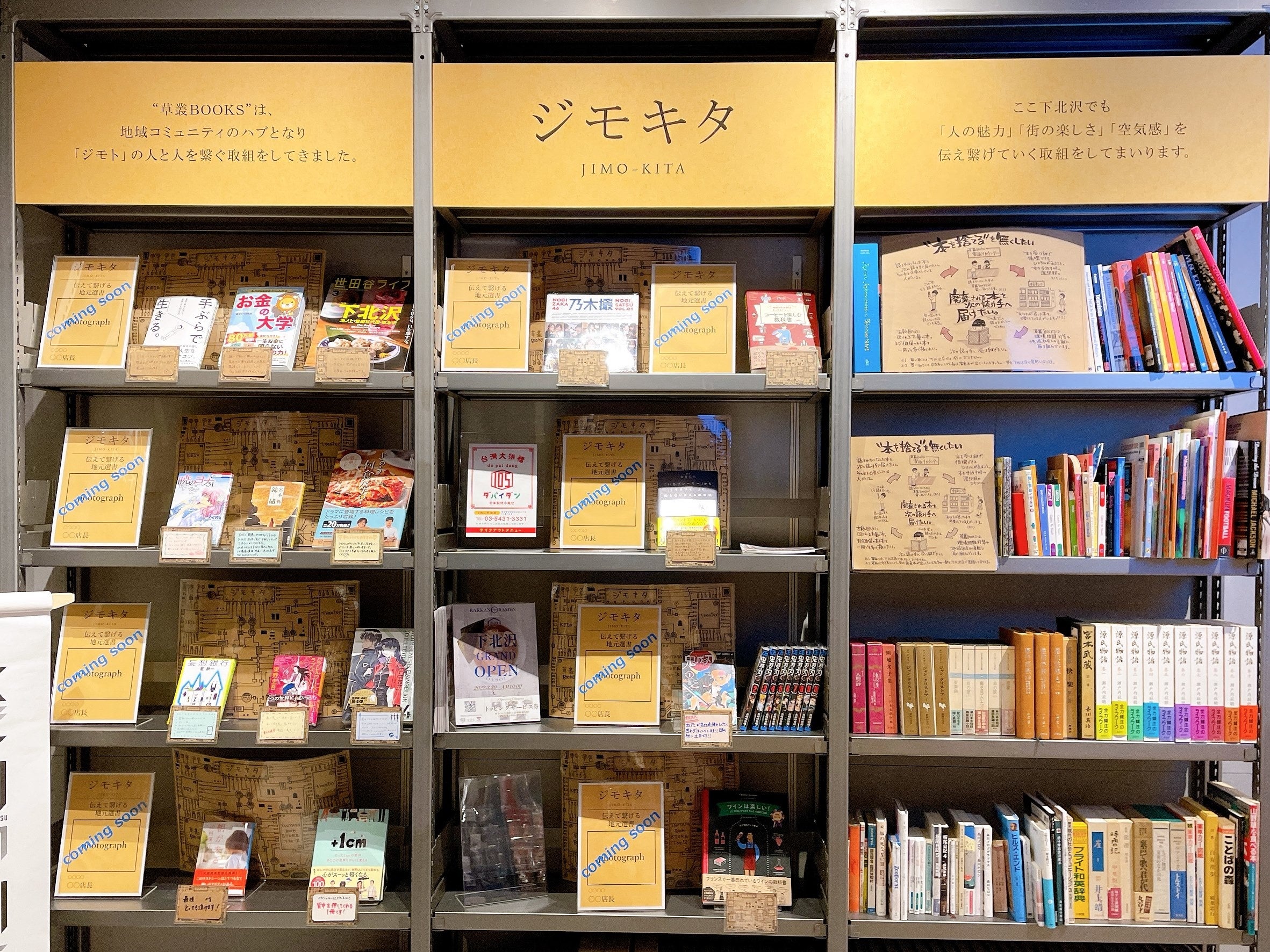 東海エリアに2店舗を展開する「草叢BOOKS」の常設ポップアップストアでは、オープンを記念して、下北沢を「これまで以上に多様な挑戦が生まれる街=実験区」として盛り上げるため、クラウドファンディングサイト「GREEN FUNDING」で商品化した最新ガジェットの展示販売や、「ジモキタ」というテーマのもと、「ミカン下北」テナントスタッフの方々のコメント付きでオススメ書籍の展開をしています。