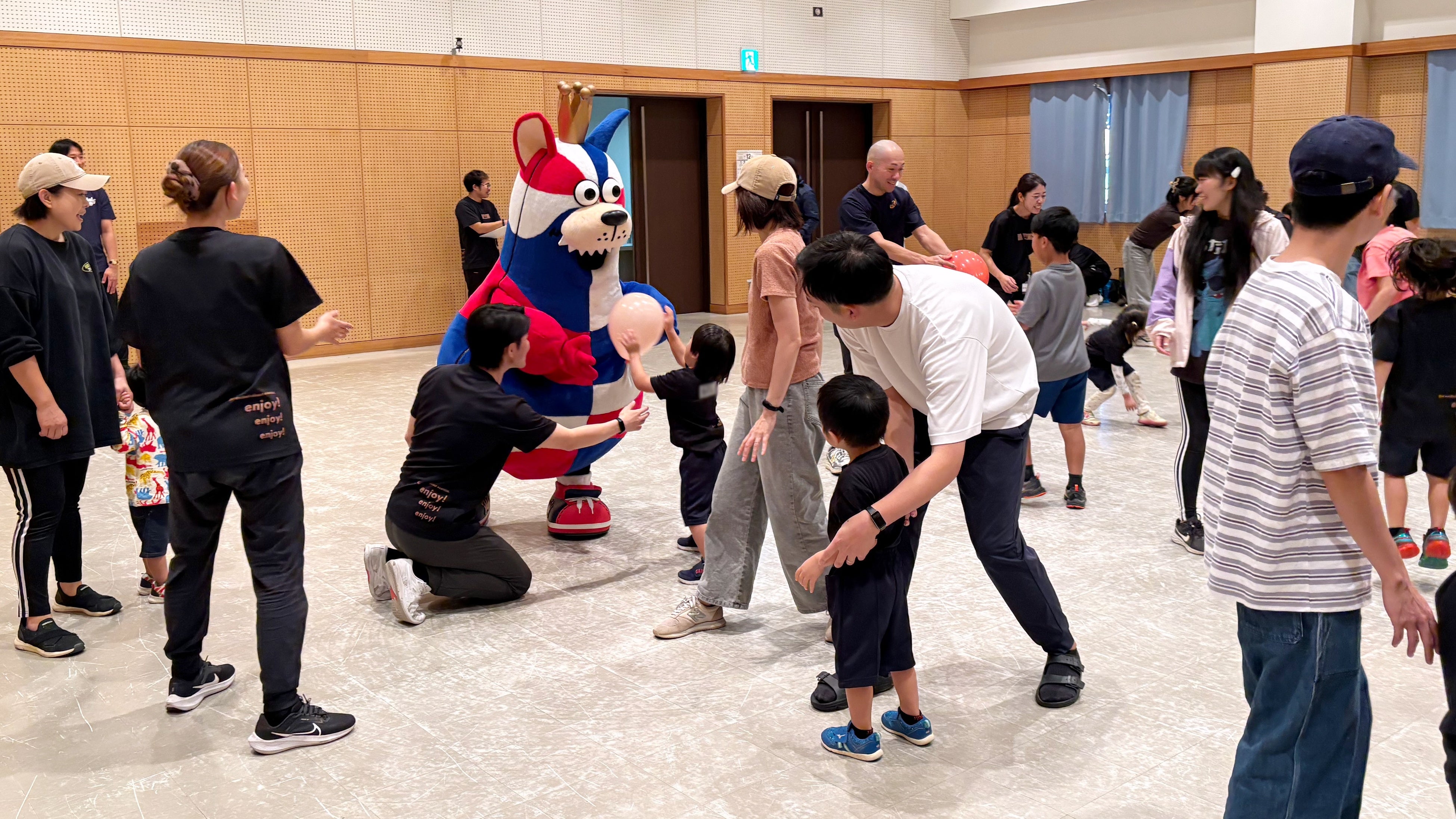 ボール遊びでは、ゴーディーとの交流に笑顔を見せながら、シュートの打ち方の指導のもと「できた!」という成功体験を重ねていく子どもたちの姿が印象的でした。先生方にも温かく見守っていただき、和やかな雰囲気の中で実施することができました。また、風船を使った交流も行い、ご家族の皆さまにもゴーディーとのふれあいを楽しんでいただきました。