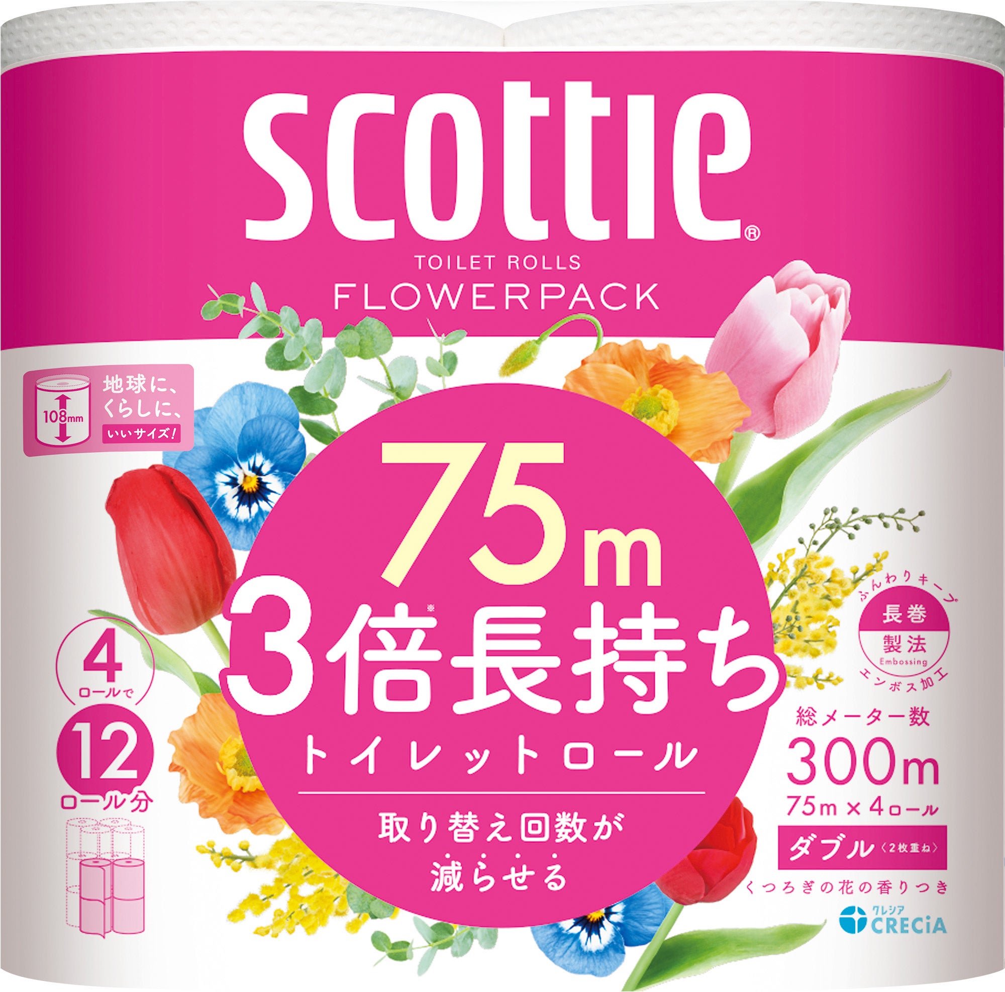【内容】4ロールで12ロール分の長さ(※日本製紙クレシア社製品比)のトイレットペーパー。1ロールで3ロール分の長さだから、取り替えの手間が減り、収納スペースも1/3に収まります。