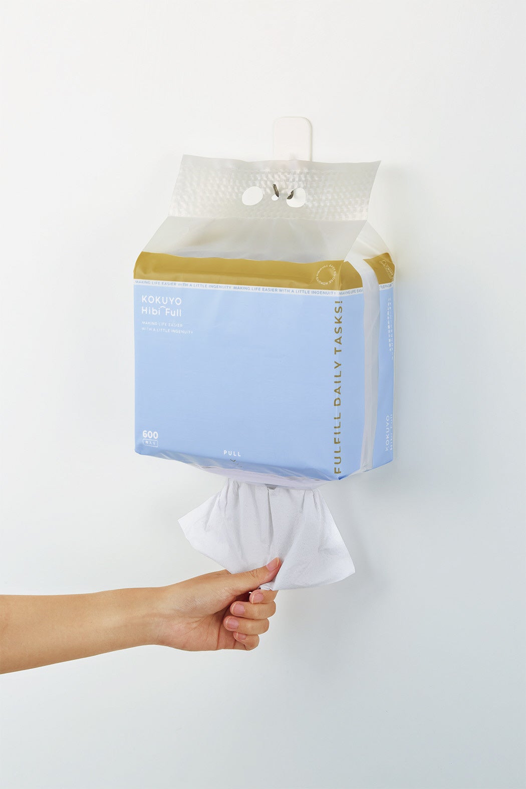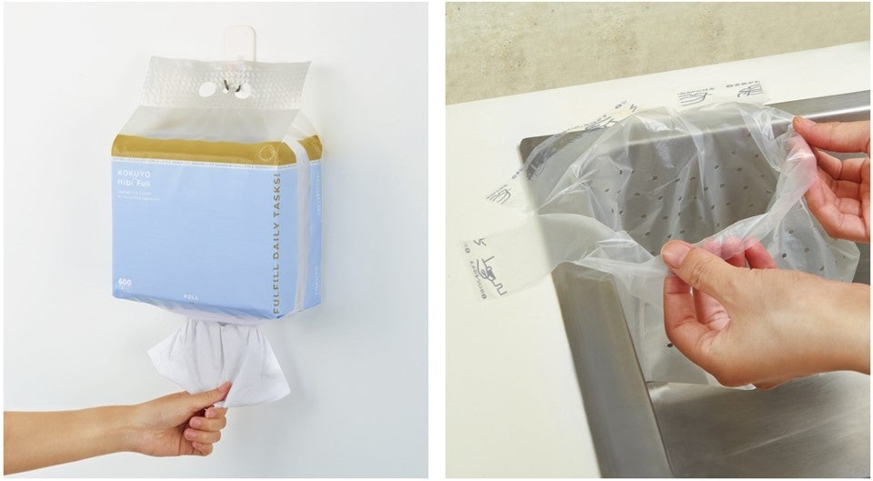 ラインアップは、「浮かせて設置」することで水回りを清潔に保つ2アイテムです。大容量で交換の手間を削減し、壁に吊るして浮かせることで省スペースに使える「大容量で交換の手間が減る吊り下げられるペーパータオル」は、下から取り出す構造により、未使用の紙を清潔に保てます。また、「シンクに貼って浮かせる三角コーナーがいらない水切り袋」は、シンクの端に貼るだけで浮かせて設置でき、ヌメりや汚水の滴りを防ぎながら、三角コーナー設置の負担を軽減します。置き場所に困りがちな水回りや共有スペースにおいて、「浮かせて設置する」というアプローチで、清掃負担の軽減とスペースの有効活用を同時に実現しました。