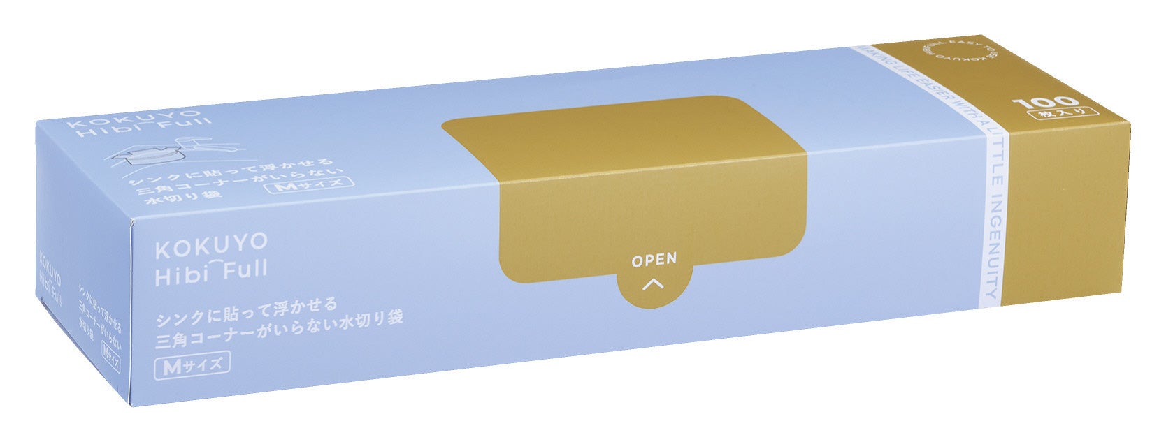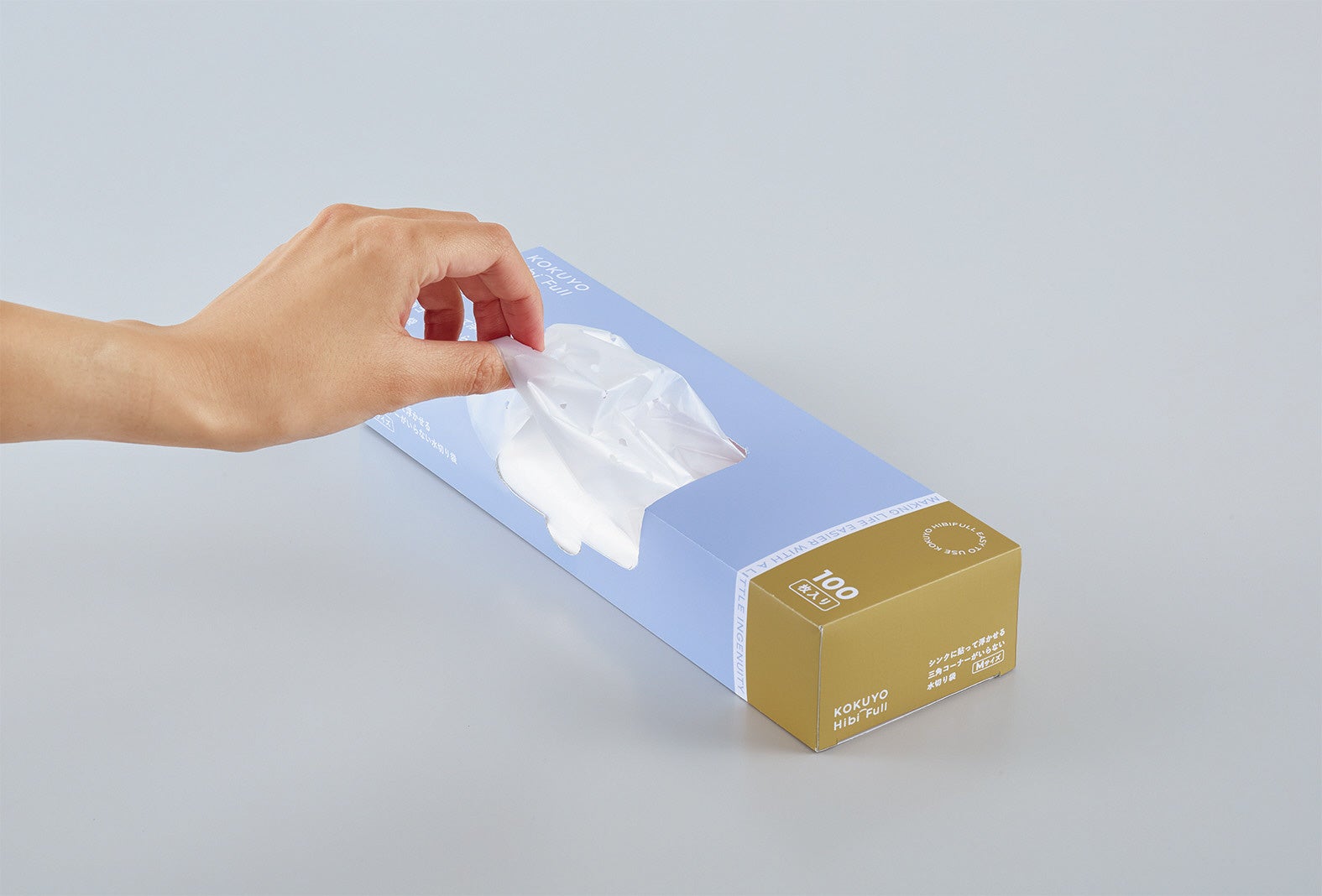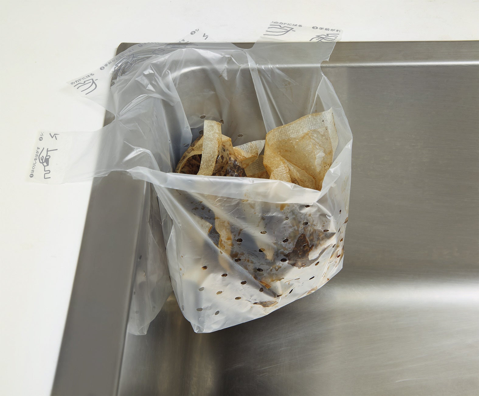 給湯室のシンクにシールで貼り付けて浮かせて設置する、使い捨てタイプの水切り袋です。浮かせることで袋の底がシンクに触れない状態で設置できるため、底面がヌメらずシンクを清潔に保てます。使用後はシールを剥がしてそのまま捨てられるので、不快な三角コーナーの掃除の手間も削減します。小さい穴が多数開いているため、水切れが良く、茶殻など細かなごみをしっかりキャッチしながら捨てる際のポタポタとした水垂れを防止します。収納場所に合わせて「縦・横」どちらからでも取り出せるパッケージを採用し、100枚入りの大容量です。
