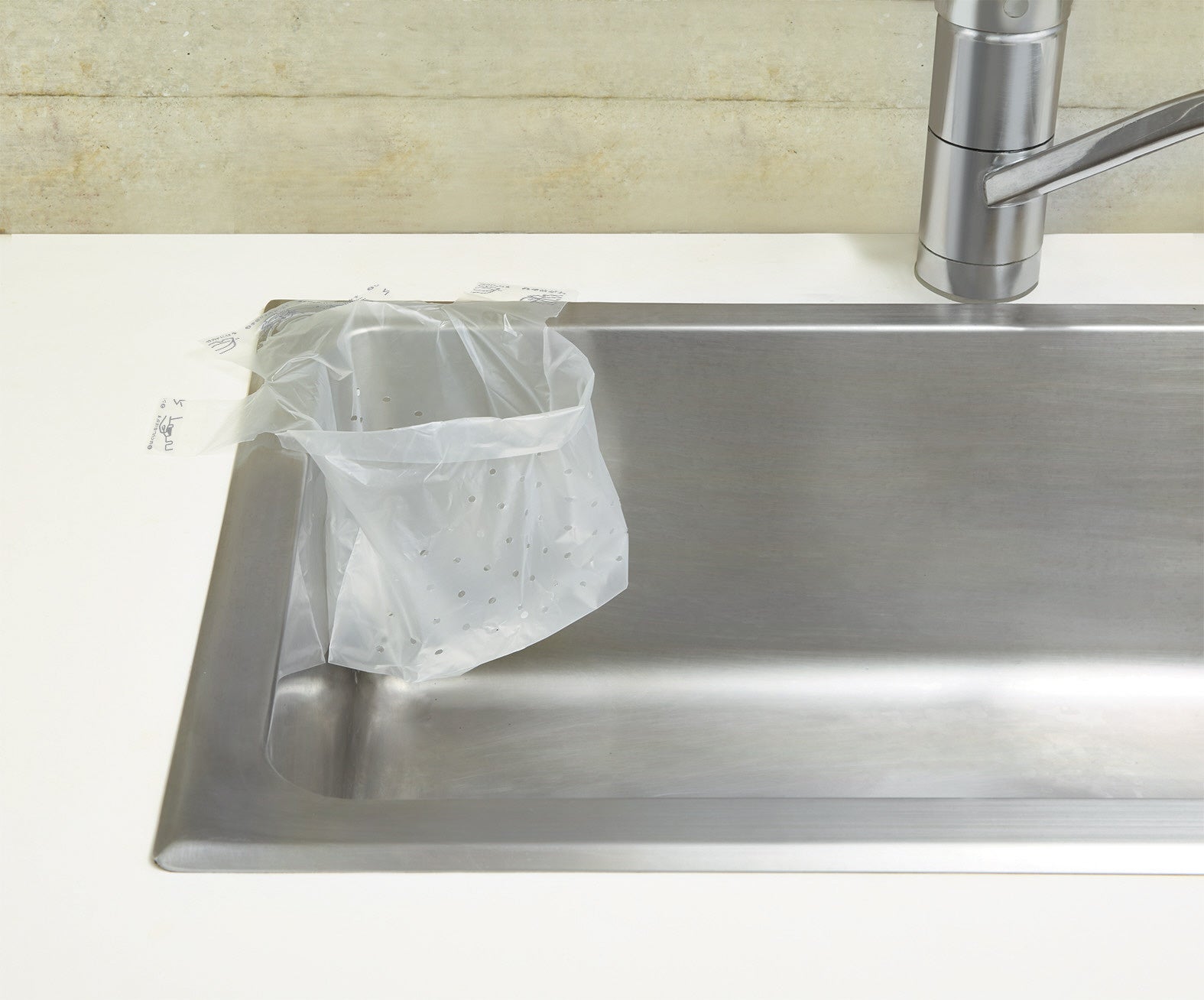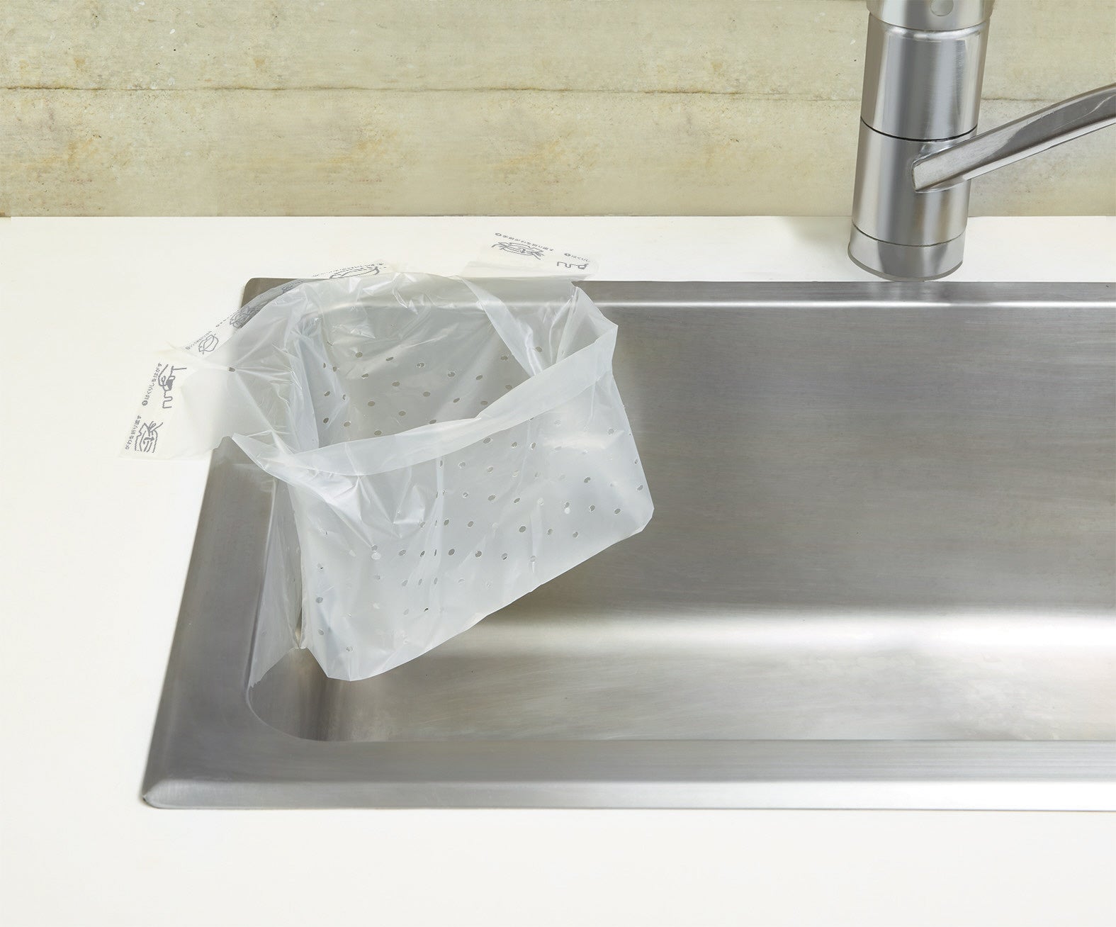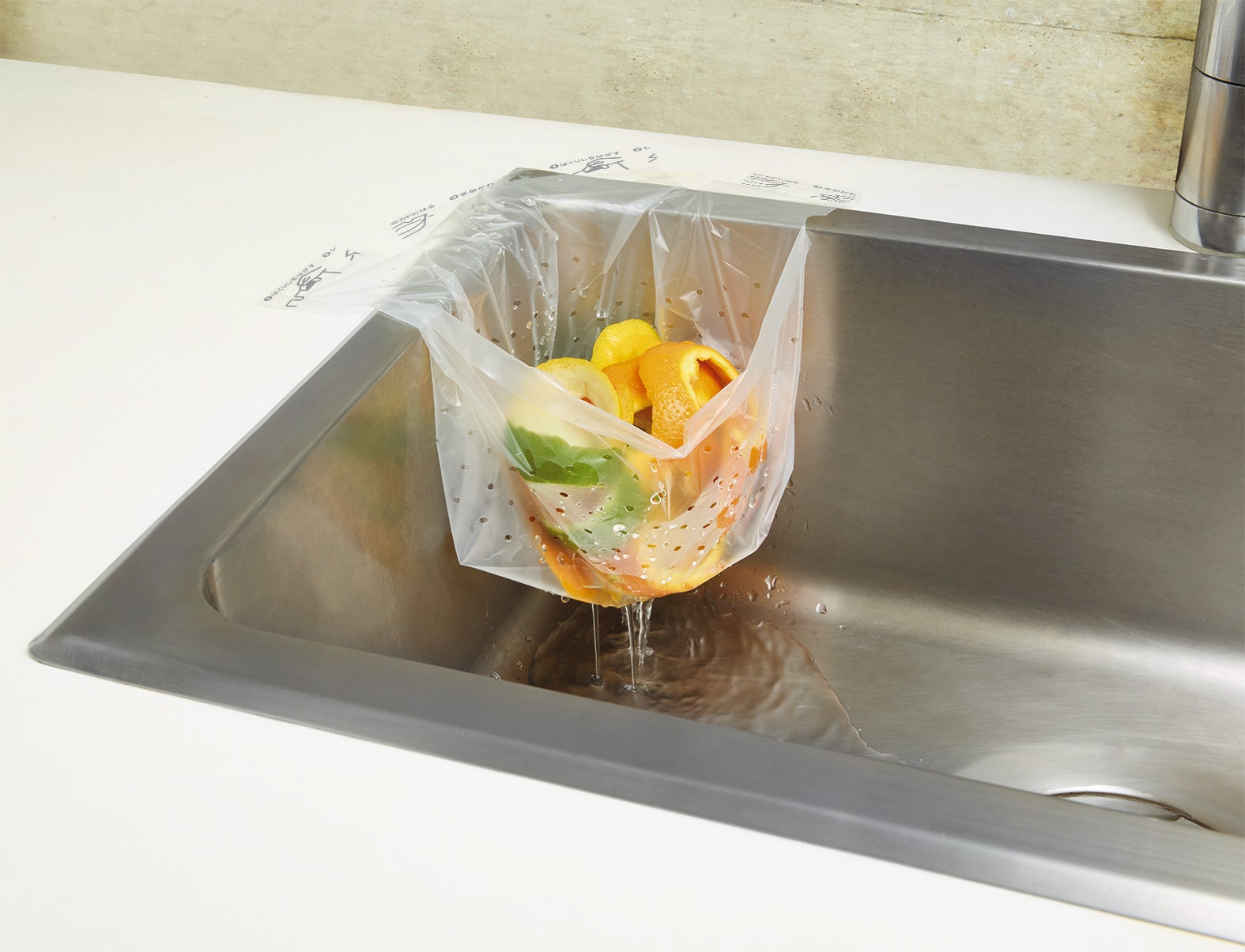 給湯室のシンクにシールで貼り付けて浮かせて設置する、使い捨てタイプの水切り袋です。浮かせることで袋の底がシンクに触れない状態で設置できるため、底面がヌメらずシンクを清潔に保てます。使用後はシールを剥がしてそのまま捨てられるので、不快な三角コーナーの掃除の手間も削減します。小さい穴が多数開いているため、水切れが良く、茶殻など細かなごみをしっかりキャッチしながら捨てる際のポタポタとした水垂れを防止します。収納場所に合わせて「縦・横」どちらからでも取り出せるパッケージを採用し、100枚入りの大容量です。