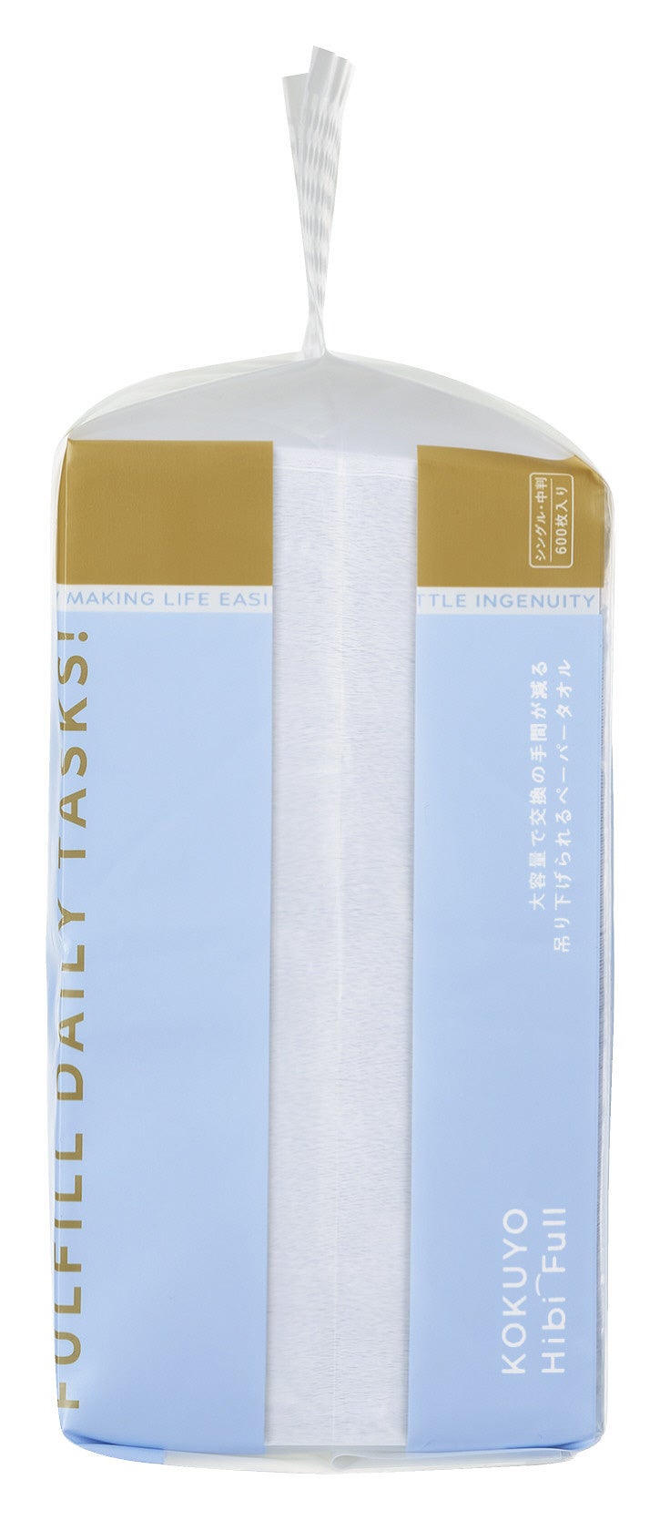 トイレや洗面所での頻繁な補充交換作業を軽減する600枚入りの大容量ペーパータオルです。パッケージにはフック穴があり、壁面に吊り下げての設置が可能。省スペースなだけでなく、下から引き出す構造のため、未使用の紙に水がかかりにくく衛生的です。側面の透明窓から残量を確認できるため、交換タイミングもひと目で把握可能です。サイズは中判(200×200mm)で、1枚でも手の水分を拭き取りやすいサイズ感となっています。