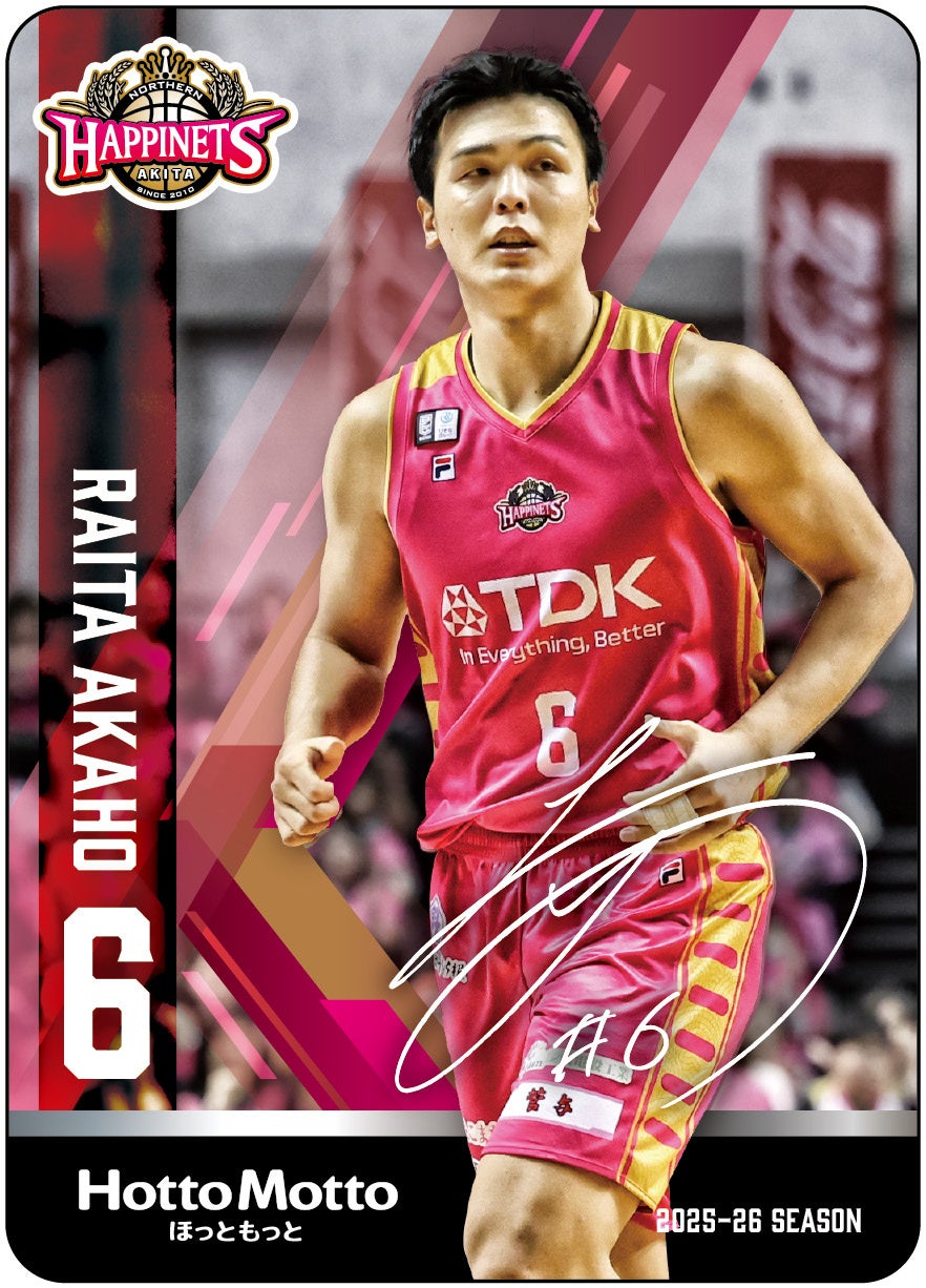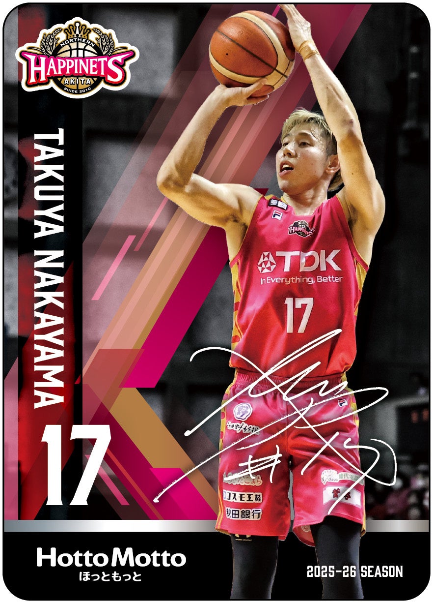 「秋田ノーザンハピネッツ弁当」は、選手の好きなおかずが入っており、好きなおかず1位の“牛焼肉”入りの『秋田ノーザンハピネッツ弁当(牛焼肉&メンチカツ)』820円、好きなおかず2位の“しょうが焼き”入りの『秋田ノーザンハピネッツ弁当(しょうが焼き&豆腐ハンバーグ天)』820円の2種類を発売いたします。また「秋田ノーザンハピネッツ弁当」には、Bリーグ2025-26シーズンのオリジナル選手カードが必ず1枚付いてきます(全13種)。中には選手の直筆サインが入っていることも!?どのカードが出るか、袋を開封する時のわくわく感をぜひお楽しみください。