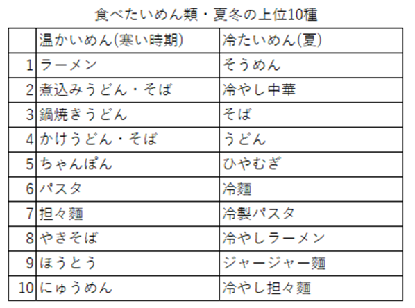 「寒い時期に食べたいめん類」と5月に調査した「夏に食べたいめん類」の上位10品目を比較してみました。
